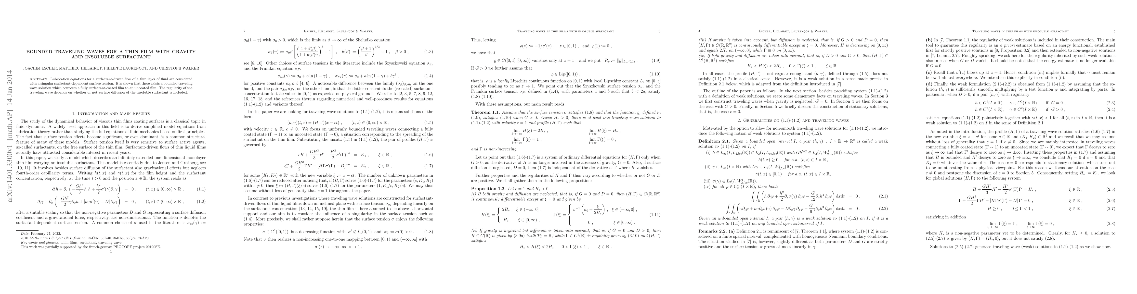 Summary: This paper investigates lubrication equations for thin fluid films with surfactant effects, demonstrating the existence of bounded traveling wave solutions connecting fully coated to uncoated films. The regularity of these waves varies based on the inclusion of insoluble surfactant surface diffusion.