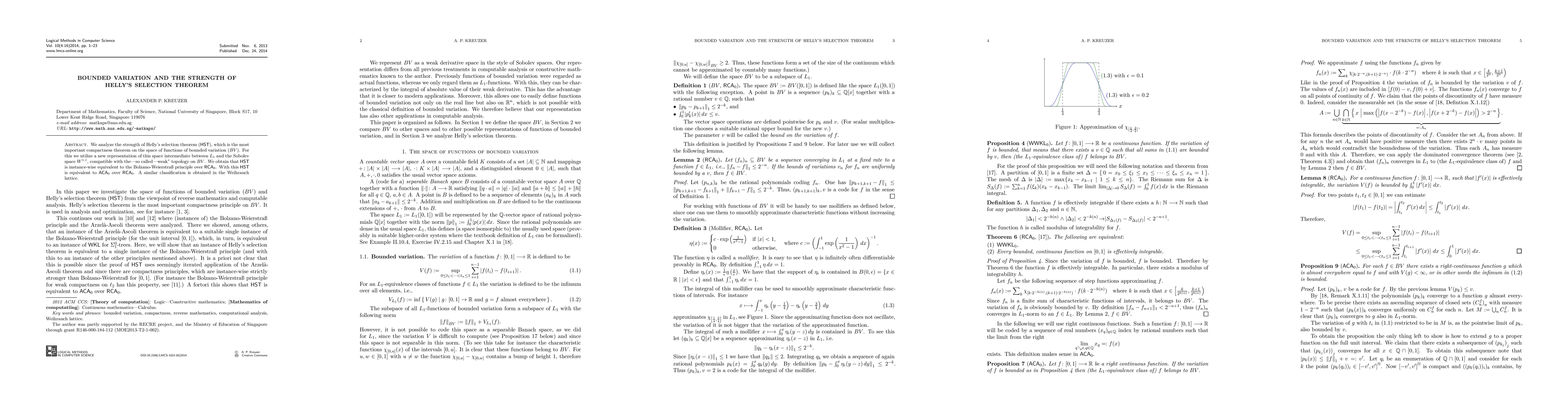 We analyze the strength of Helly's selection theorem HST, which is the most important compactness theorem on the space of functions of bounded variation. For this we utilize a new representation of this space intermediate between $L_1$ and the Sobolev space W1,1, compatible with the, so called, weak* topology. We obtain that HST is instance-wise equivalent to the Bolzano-Weierstra\ss\ principle over RCA0. With this HST is equivalent to ACA0 over RCA0. A similar classification is obtained in the Weihrauch lattice.