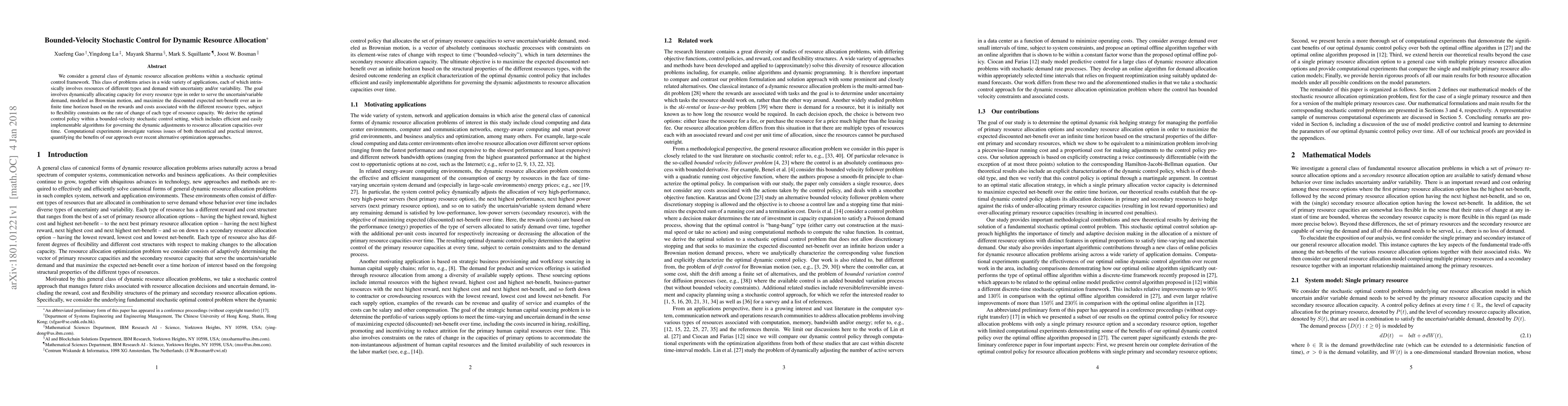 This paper develops a bounded-velocity stochastic control framework for dynamic resource allocation, optimizing the allocation of resource capacities to meet uncertain demand while maximizing discounted net-benefits. The proposed optimal control policy includes practical algorithms for resource adjustments, and computational experiments demonstrate its advantages over alternative optimization methods.