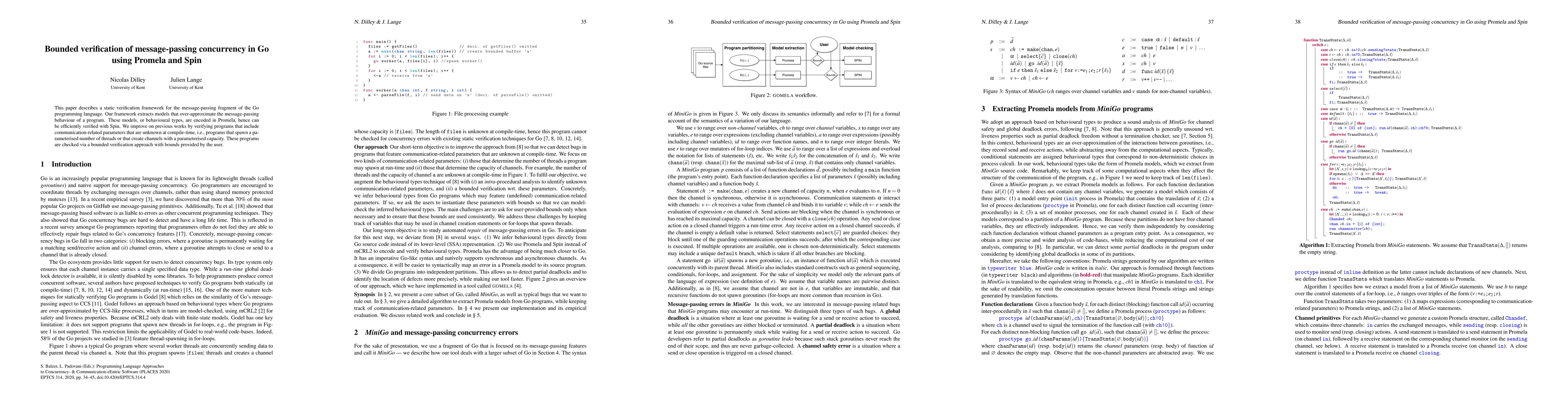 This paper presents a static verification framework for Go's message-passing concurrency, encoding models in Promela for efficient verification with Spin. It extends previous work by verifying programs with runtime-unknown communication parameters through bounded verification.