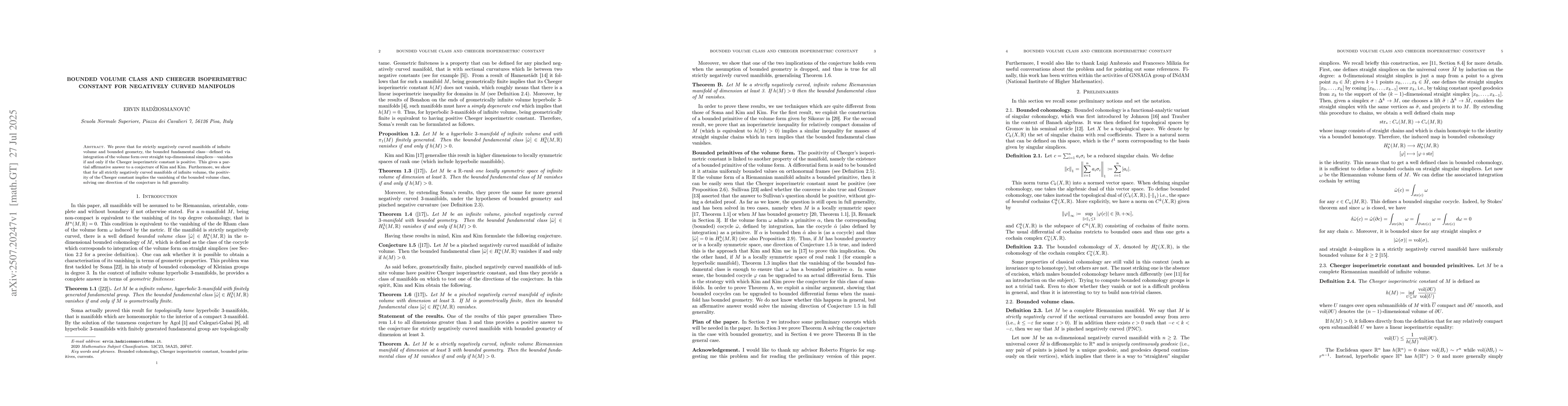 We prove that for strictly negatively curved manifolds of infinite volume and bounded geometry, the bounded fundamental class, defined via integration of the volume form over straight top-dimensional simplices, vanishes if and only if the Cheeger isoperimetric constant is positive. This gives a partial affirmative answer to a conjecture of Kim and Kim. Furthermore, we show that for all strictly negatively curved manifolds of infinite volume, the positivity of the Cheeger constant implies the vanishing of the bounded volume class, solving one direction of the conjecture in full generality.