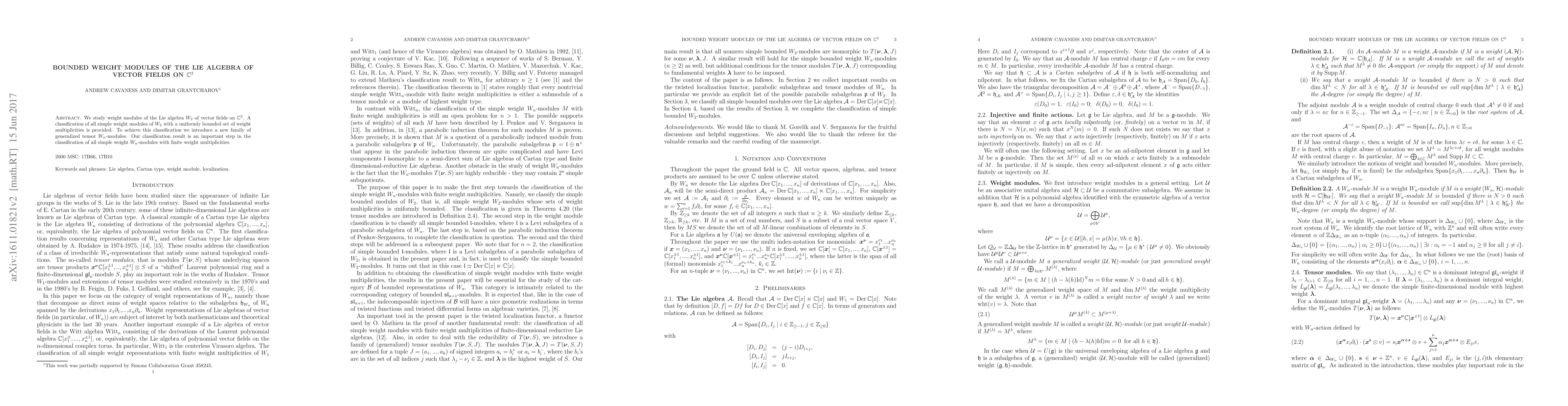 We study weight modules of the Lie algebra $W_2$ of vector fields on ${\mathbb C}^2$. A classification of all simple weight modules of $W_2$ with a uniformly bounded set of weight multiplicities is provided. To achieve this classification we introduce a new family of generalized tensor $W_n$-modules. Our classification result is an important step in the classification of all simple weight $W_n$-modules with finite weight multiplicities.
