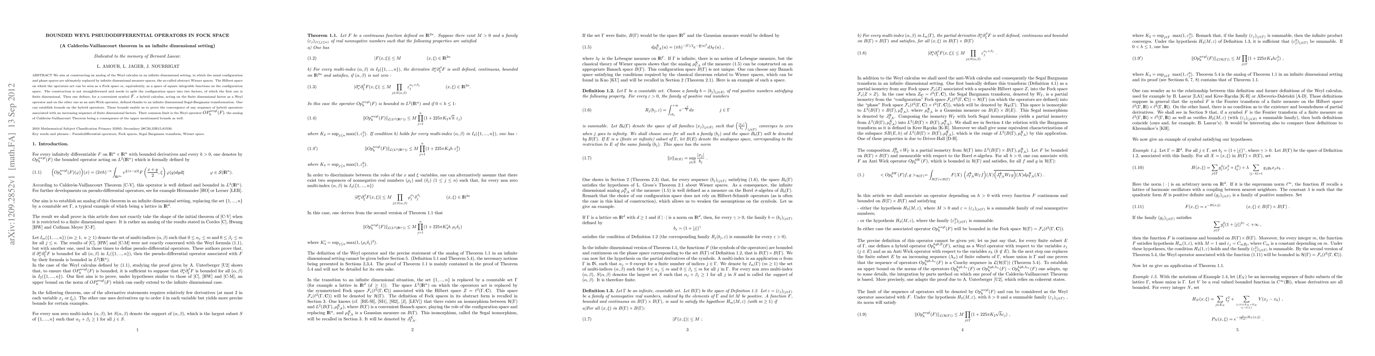 We aim at constructing an analog of the Weyl calculus in an infinite dimensional setting, in which the usual configuration and phase spaces are ultimately replaced by infinite dimensional measure spaces, the so-called abstract Wiener spaces. The Hilbert space on which the operators act can be seen as a Fock space or, equivalently, as a space of square integrable functions on the configuration space. The construction is not straightforward and needs to split the configuration space into two factors, of which the first one is finite dimensional. Then one defines, for a convenient symbol $F$, a hybrid calculus, acting on the finite dimensional factor as a Weyl operator and on the other one as an anti-Wick operator, defined thanks to an infinite dimensional Segal-Bargmann transformation. One can establish bounds on the hybrid operators. These bounds enable us to prove the convergence of any sequence of hybrid operators associated with an increasing sequence of finite dimensional factors. Their common limit is the Weyl operator $OP_h^{weyl}(F)$, the analog of Calder\'on-Vaillancourt Theorem being a consequence of the upper mentionned bounds as well.