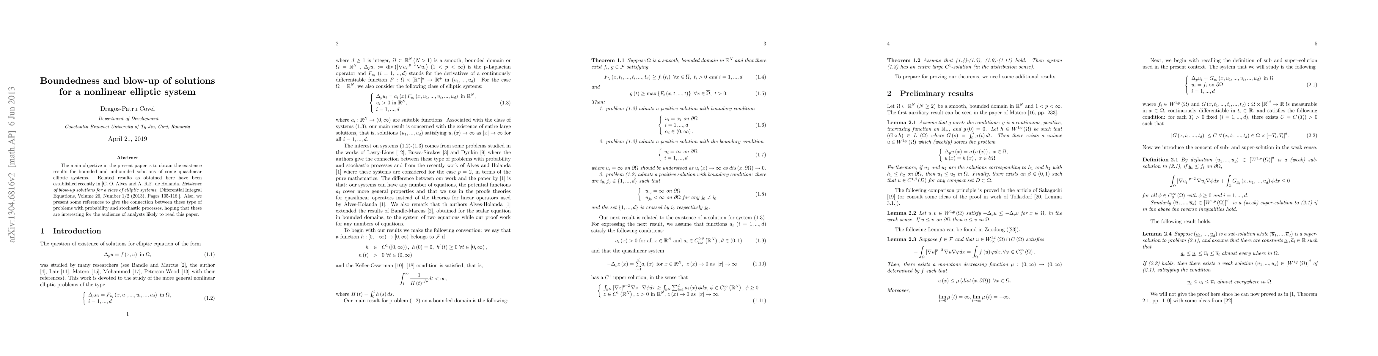 Summary: This paper investigates the boundedness and potential blow-up of solutions for a nonlinear elliptic system connected to probability and stochastic processes, providing insights into the behavior of such systems under various conditions.