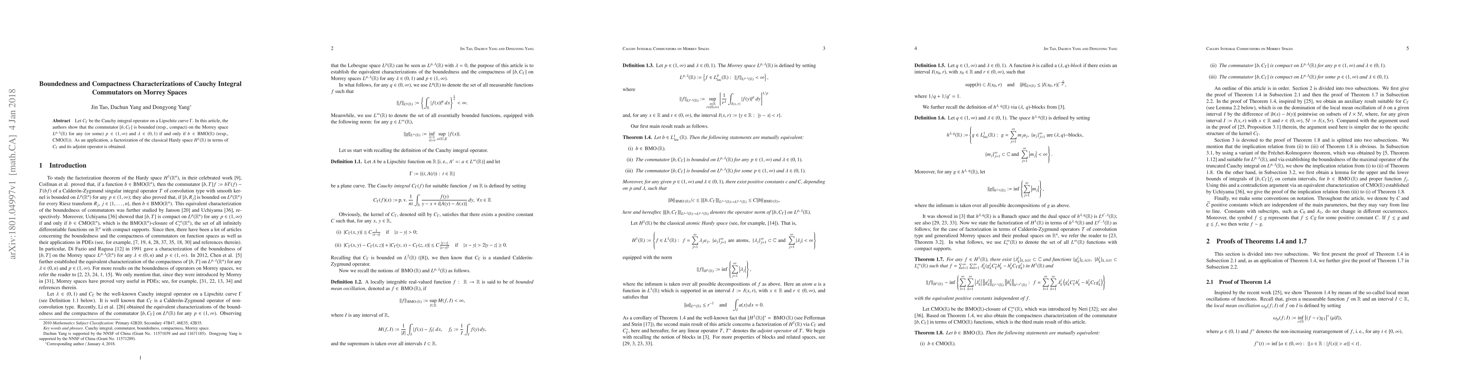 Let $C_\Gamma$ be the Cauchy integral operator on a Lipschitz curve $\Gamma$. In this article, the authors show that the commutator $[b,C_\Gamma]$ is bounded (resp., compact) on the Morrey space $L^{p,\,\lambda}(\mathbb R)$ for any (or some) $p\in(1, \infty)$ and $\lambda\in(0, 1)$ if and only if $b\in {\rm BMO}(\mathbb R)$ (resp., ${\rm CMO}(\mathbb R)$). As an application, a factorization of the classical Hardy space $H^1(\mathbb R)$ in terms of $C_\Gamma$ and its adjoint operator is obtained.