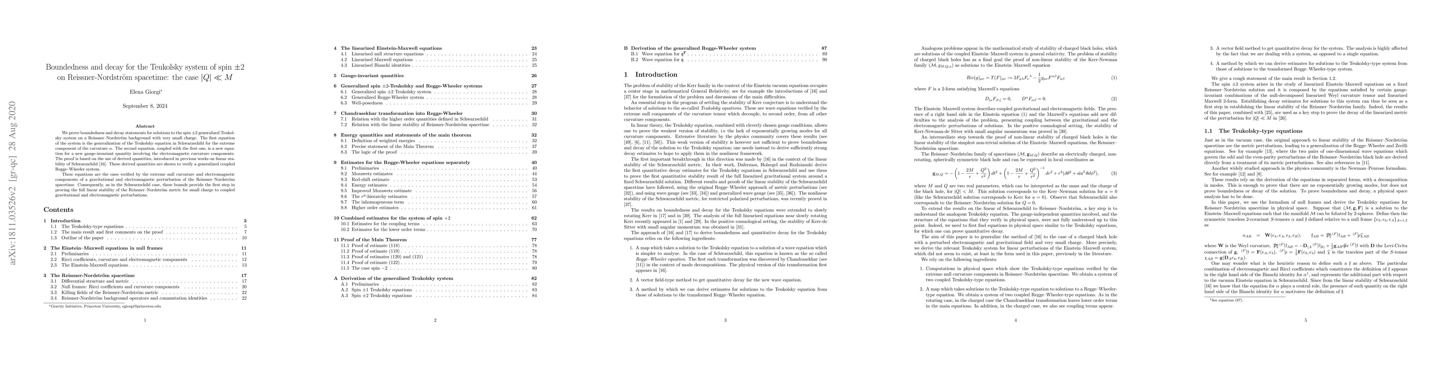 This paper proves boundedness and polynomial decay for solutions to the spin $\pm2$ Teukolsky system on Reissner-Nordström spacetime with small charge, establishing a foundation for proving the full linear stability of the metric under coupled gravitational and electromagnetic perturbations. The results are derived from a generalized coupled Regge-Wheeler system.