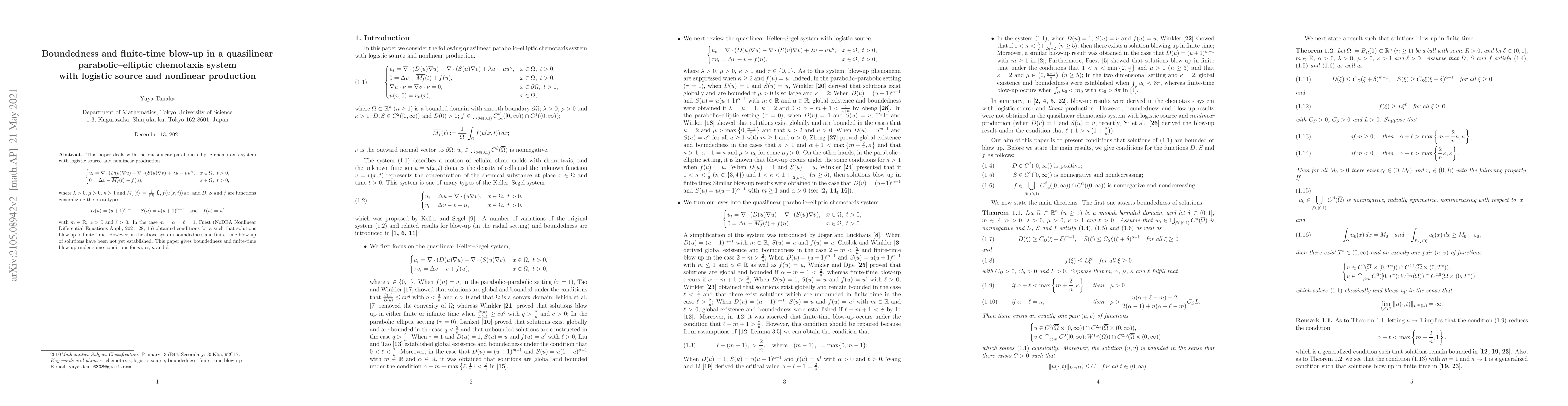 This paper investigates the quasilinear parabolic-elliptic chemotaxis system with logistic source and nonlinear production, establishing conditions under which solutions exhibit boundedness and finite-time blow-up. The findings extend previous results by providing new insights into the system's dynamics.