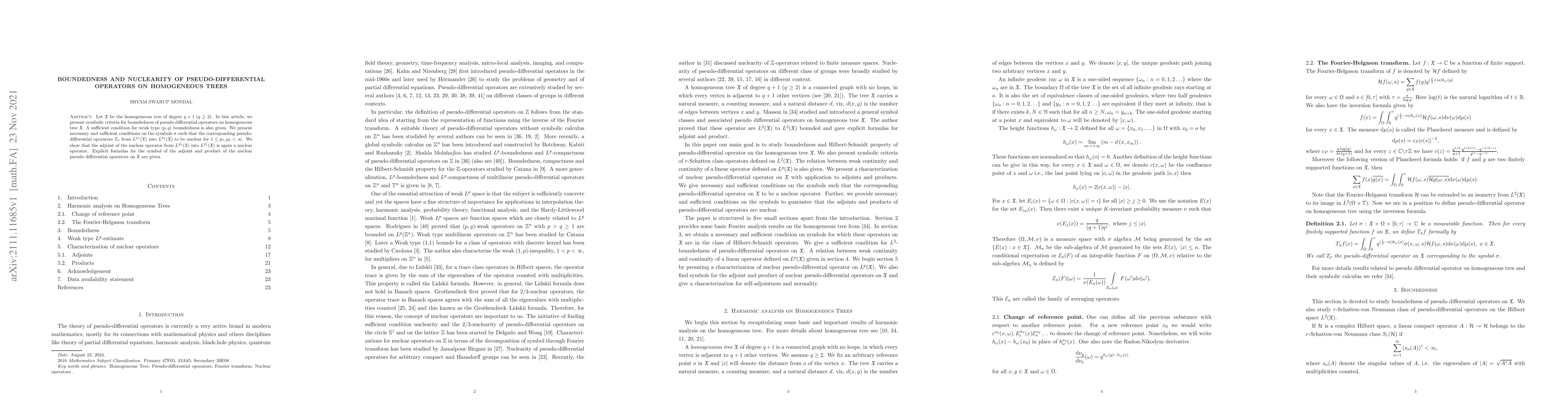 This paper investigates pseudo-differential operators on homogeneous trees, providing symbolic criteria for their boundedness and weak type $(p, q)$ boundedness. It also establishes necessary and sufficient conditions for these operators to be nuclear, presenting explicit formulas for adjoints and products of nuclear operators.