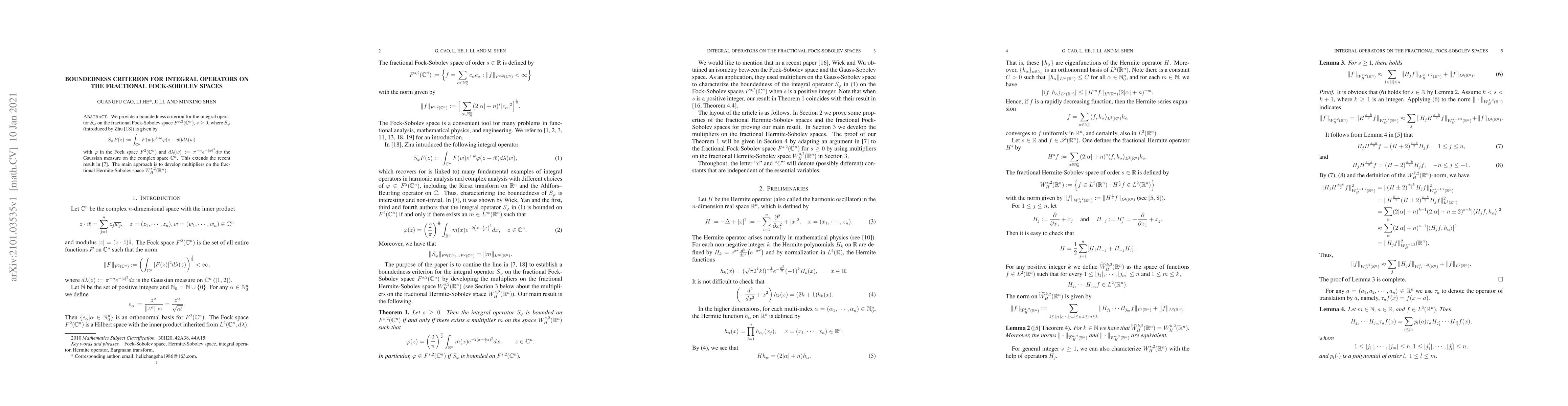 We provide a boundedness criterion for the integral operator $S_{\varphi}$ on the fractional Fock-Sobolev space $F^{s,2}(\mathbb C^n)$, $s\geq 0$, where $S_{\varphi}$ (introduced by Kehe Zhu) is given by \begin{eqnarray*} S_{\varphi}F(z):= \int_{\mathbb{C}^n} F(w) e^{z \cdot\bar{w}} \varphi(z- \bar{w}) d\lambda(w) \end{eqnarray*} with $\varphi$ in the Fock space $F^2(\mathbb C^n)$ and $d\lambda(w): = \pi^{-n} e^{-|w|^2} dw$ the Gaussian measure on the complex space $\mathbb{C}^{n}$. This extends the recent result in Cao--Li--Shen--Wick--Yan. The main approach is to develop multipliers on the fractional Hermite-Sobolev space $W_H^{s,2}(\mathbb R^n)$.