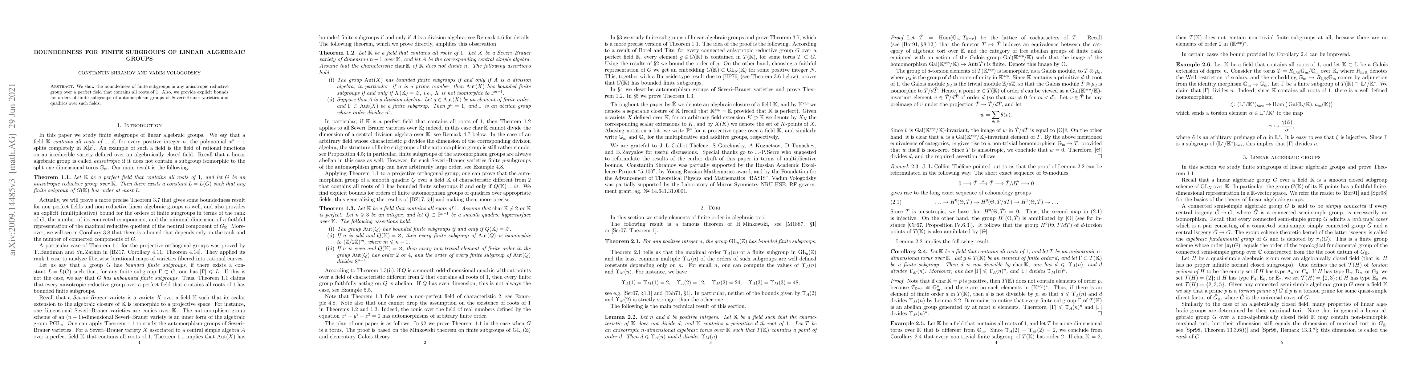 This paper demonstrates the boundedness of finite subgroups within anisotropic reductive algebraic groups over perfect fields containing all roots of 1, and provides explicit bounds for finite subgroups of automorphism groups of Severi-Brauer varieties and quadrics over these fields.