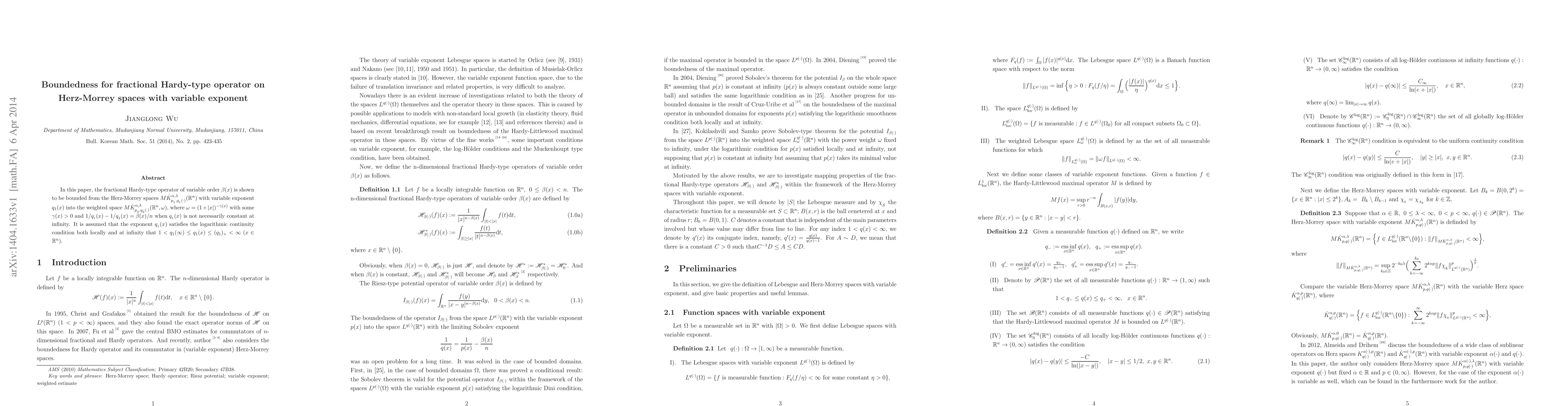 In this paper, the fractional Hardy-type operator of variable order $\beta(x)$ is shown to be bounded from the Herz-Morrey spaces $M\dot{K}_{p_{_{1}},q_{_{1}}(\cdot)}^{\alpha,\lambda}(\mathbb{R}^{n})$ with variable exponent $q_{1}(x)$ into the weighted space $M\dot{K}_{p_{_{2}},q_{_{2}}(\cdot)}^{\alpha,\lambda}(\mathbb{R}^{n},\omega)$, where $\omega=(1+|x|)^{-\gamma(x)}$ with some $\gamma(x)>0$ and $ 1/q_{_{1}}(x)-1/q_{_{2}}(x)=\beta(x)/n$ when $q_{_{1}}(x)$ is not necessarily constant at infinity. It is assumed that the exponent $q_{_{1}}(x)$ satisfies the logarithmic continuity condition both locally and at infinity that $1< q_{1}(\infty)\le q_{1}(x)\le( q_{1})_{+}<\infty~(x\in \mathbb{R}^{n})$.