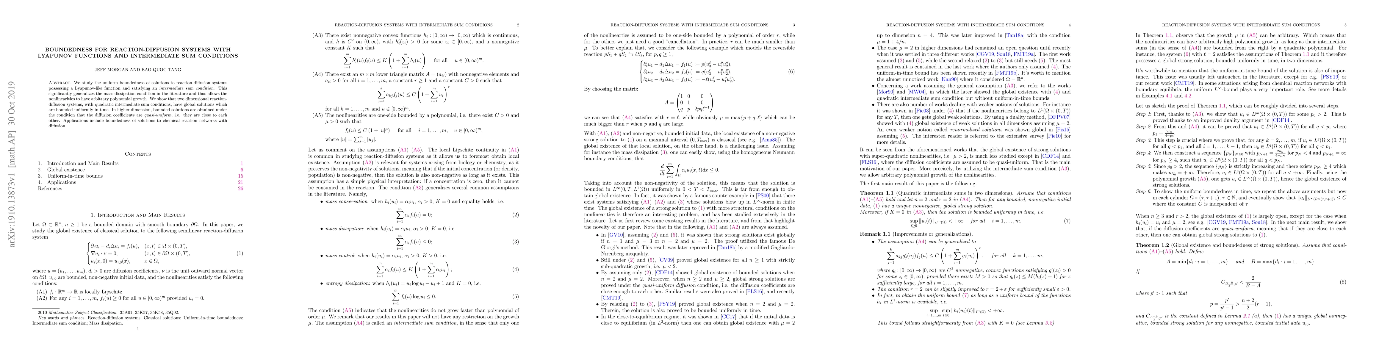 This paper investigates the uniform boundedness of solutions to reaction-diffusion systems using Lyapunov-like functions and intermediate sum conditions, generalizing mass dissipation conditions. It demonstrates that two-dimensional systems with quadratic intermediate sum conditions have globally bounded solutions, while higher-dimensional systems require quasi-uniform diffusion coefficients for boundedness.