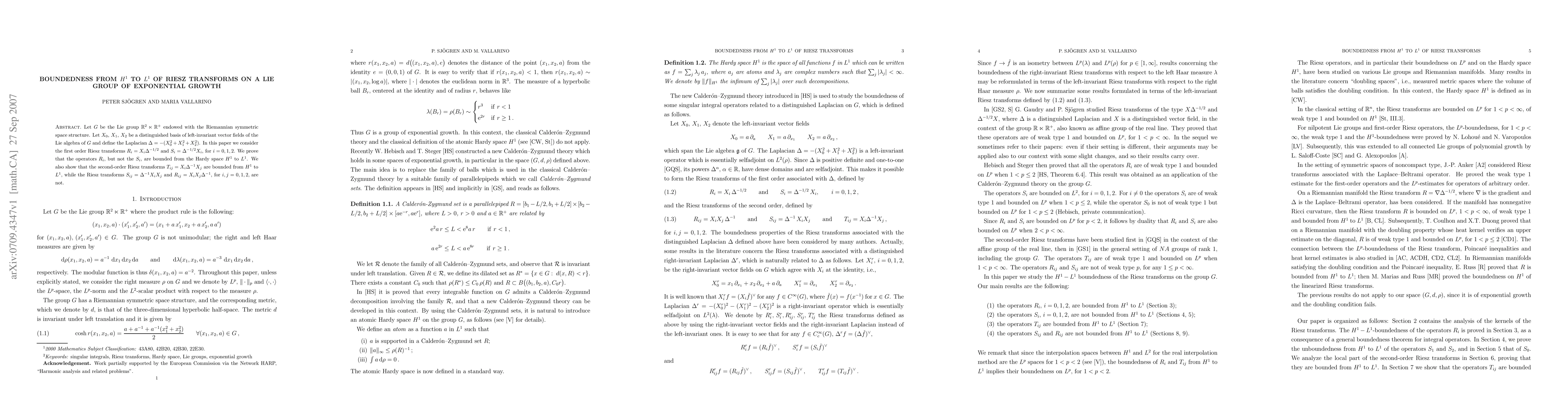 Researchers prove that first-order Riesz transforms on a specific Lie group with exponential growth are bounded from Hardy space $H^1$ to $L^1$, but not second-order transforms.