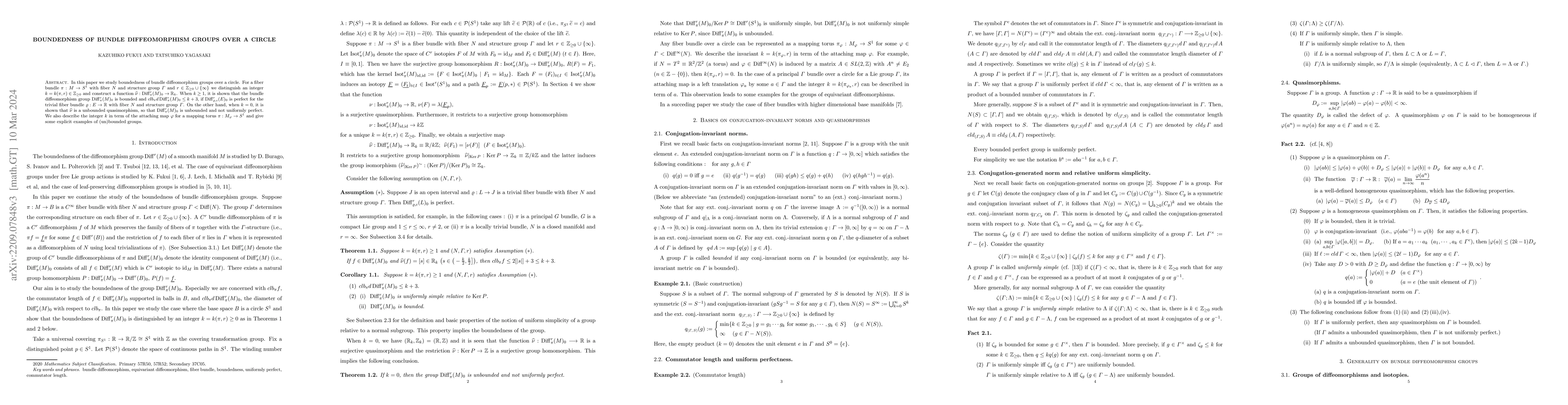 In this paper we study boundedness of bundle diffeomorphism groups over a circle. For a fiber bundle $\pi : M \to S^1$ with fiber $N$ and structure group $\Gamma$ and $r \in {\Bbb Z}_{\geq 0} \cup \{ \infty \}$ we distinguish an integer $k = k(\pi, r) \in {\Bbb Z}_{\geq 0}$ and construct a function $\widehat{\nu} : {\rm Diff}_\pi(M)_0 \to {\Bbb R}_k$. When $k \geq 1$, it is shown that the bundle diffeomorphism group ${\rm Diff}_\pi(M)_0$ is uniformly perfect and $clb_\pi\,{\rm Diff}^r_\pi(M)_0 \leq k+3$, if ${\rm Diff}_{\rho, c}(E)_0$ is perfect for the trivial fiber bundle $\rho : E \to {\Bbb R}$ with fiber $N$ and structure group $\Gamma$. On the other hand, when $k = 0$, it is shown that $\widehat{\nu}$ is a unbounded quasimorphism, so that ${\rm Diff}_\pi(M)_0$ is unbounded and not uniformly perfect. We also describe the integer $k$ in term of the attaching map $\phi$ for a mapping torus $\pi : M_\phi \to S^1$ and give some explicit examples of (un)bounded groups.