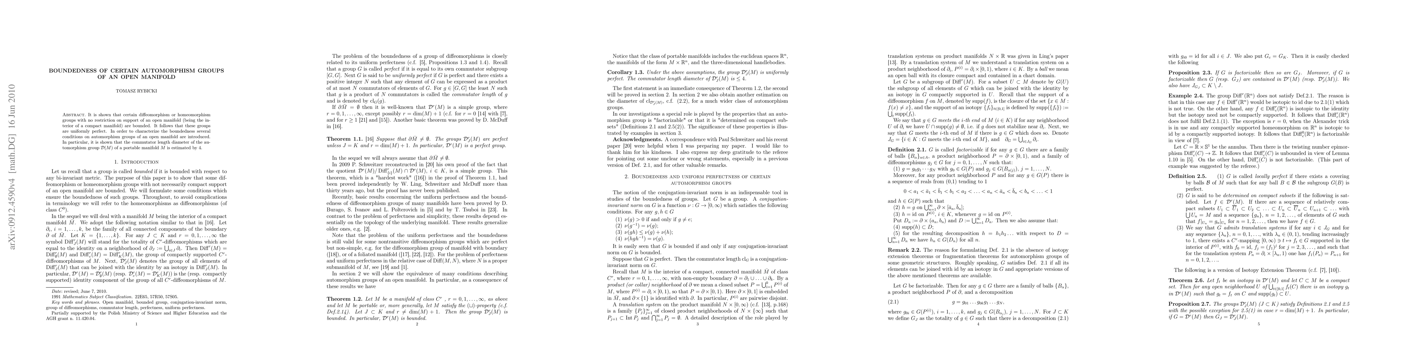 Researchers show that certain groups of diffeomorphisms on open manifolds with no restriction on support are bounded, implying they are uniformly perfect. They introduce a condition related to the commutator length diameter to characterize these boundedness.
