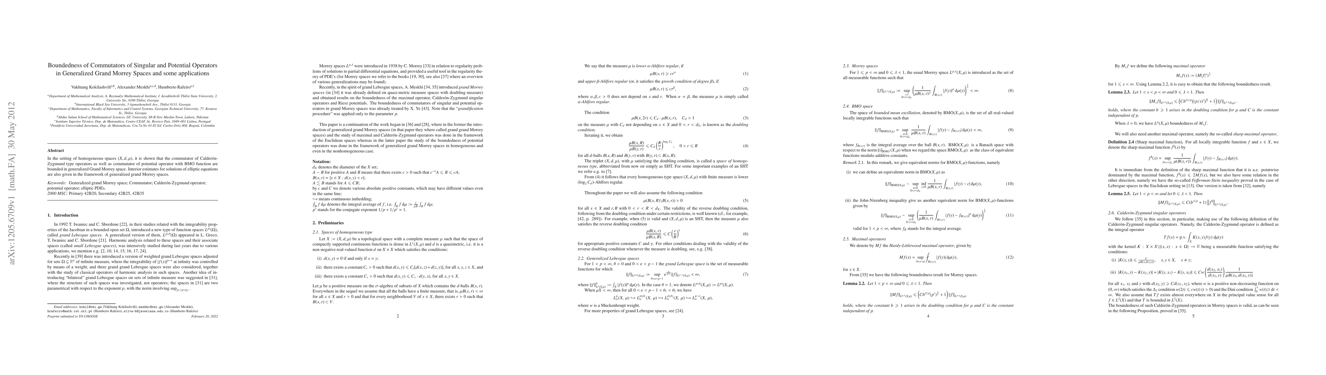In the setting of homogeneous spaces (X,d,{\mu}), it is shown that the commutator of Calder\'on- Zygmund type operators as well as commutator of potential operator with BMO function are bounded in generalized Grand Morrey space. Interior estimates for solutions of elliptic equations are also given in the framework of generalized grand Morrey spaces.