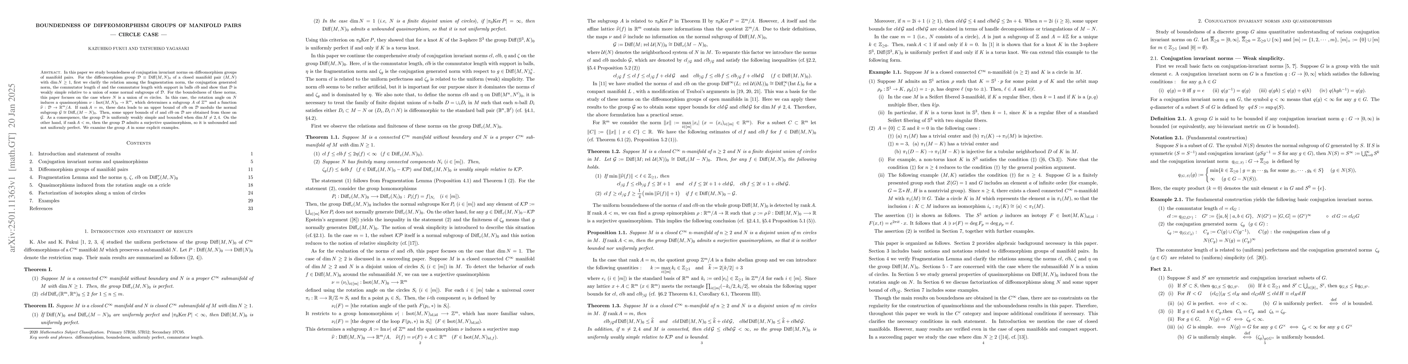In this paper we study boundedness of conjugation invariant norms on diffeomorphism groups of manifold pairs. For the diffeomorphism group ${\mathcal D} \equiv {\rm Diff}(M,N)_0$ of a closed manifold pair $(M, N)$ with $\dim N \geq 1$, first we clarify the relation among the fragmentation norm, the conjugation generated norm, the commutator length $cl$ and the commutator length with support in balls $clb$ and show that ${\mathcal D}$ is weakly simple relative to a union of some normal subgroups of ${\mathcal D}$. For the boundedness of these norms, this paper focuses on the case where $N$ is a union of $m$ circles. In this case, the rotation angle on $N$ induces a quasimorphism $\nu : {\rm Isot}(M, N)_0 \to {\Bbb R}^m$, which determines a subgroup $A$ of ${\Bbb Z}^m$ and a function $\widehat{\nu} : {\mathcal D} \to {\Bbb R}^m/A$. If ${\rm rank}\,A = m$, these data leads to an upper bound of $clb$ on ${\mathcal D}$ modulo the normal subgroup ${\mathcal G} \cong {\rm Diff}_c(M - N)_0$. Then, some upper bounds of $cl$ and $clb$ on ${\mathcal D}$ are obtained from those on ${\mathcal G}$. As a consequence, the group ${\mathcal D}$ is uniformly weakly simple and bounded when $\dim M \neq 2,4$. On the other hand, if ${\rm rank}\,A < m$, then the group ${\mathcal D}$ admits a surjective quasimorphism, so it is unbounded and not uniformly perfect. We examine the group $A$ in some explicit examples.