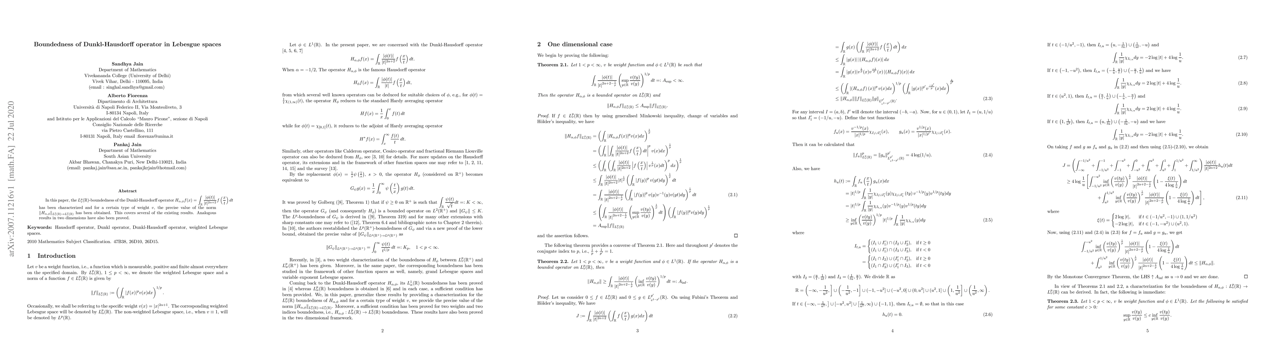 In this paper, the $L^p_v(\R)$-boundedness of the Dunkl-Hausdorff operator $\displaystyle H_{\al,\phi} f(x)=\ent\frac{ |\phi(t)|}{|t|^{2\al+2}}f\lf(\frac{x}{t}\rh) dt $ has been characterized and for a certain type of weight $v$, the precise value of the norm $\|H_{\al,\phi}\|_{L^p_v(\R)\to L^p_v(\R)}$ has been obtained. This covers several of the existing results. Analogous results in two dimensions have also been proved.