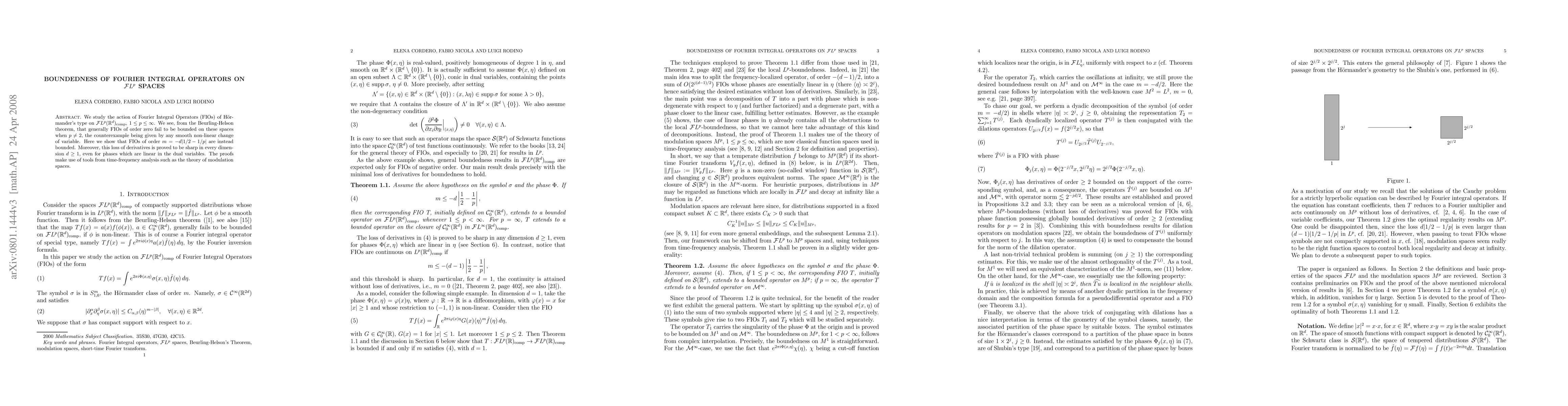 We study the action of Fourier Integral Operators (FIOs) of H{\"o}rmander's type on ${\mathcal{F}} L^p({\mathbb {R}}^d_{comp}$, $1\leq p\leq\infty$. We see, from the Beurling-Helson theorem, that generally FIOs of order zero fail to be bounded on these spaces when $p\not=2$, the counterexample being given by any smooth non-linear change of variable. Here we show that FIOs of order $m=-d|1/2-1/p|$ are instead bounded. Moreover, this loss of derivatives is proved to be sharp in every dimension $d\geq1$, even for phases which are linear in the dual variables. The proofs make use of tools from time-frequency analysis such as the theory of modulation spaces.