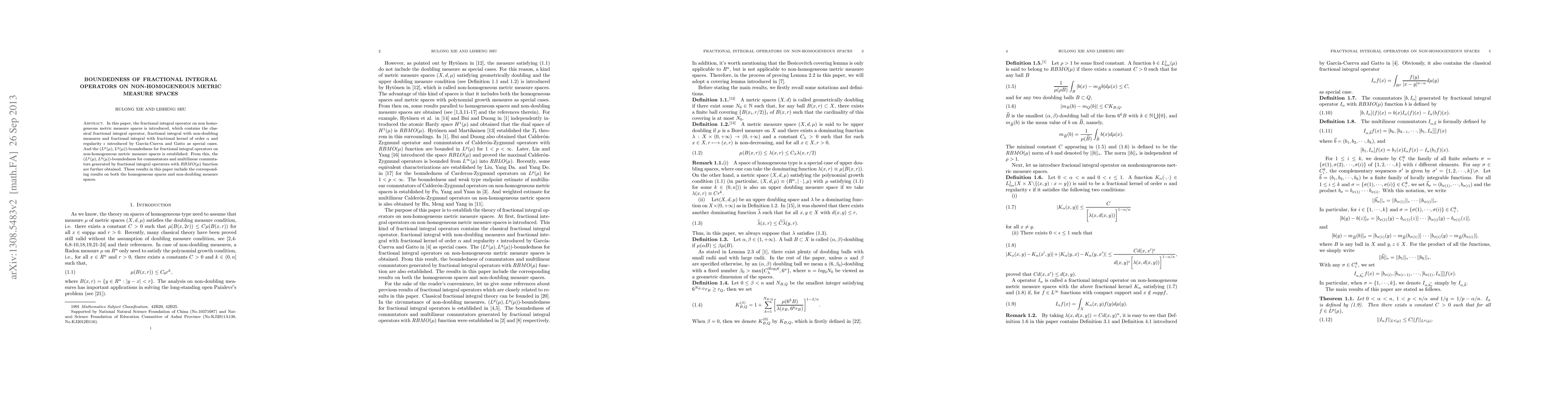 In this paper, the fractional integral operator on non-homogeneous metric measure spaces is introduced, which contains the classic fractional integral operator, fractional integral with non-doubling measures and fractional integral with fractional kernel of order $\alpha$ and regularity $\epsilon$ introduced by Garc\'{i}a-Cuerva and Gatto as special cases. And the $(L^{p}(\mu),L^{q}(\mu))$-boundedness for fractional integral operators on non-homogeneous metric measure spaces is established. From this, the $(L^{p}(\mu),L^{q}(\mu))$-boundedness for commutators and multilinear commutators generated by fractional integral operators with $RBMO(\mu)$ function are further obtained. These results in this paper includes the corresponding results on both the homogeneous spaces and non-doubling measure spaces.