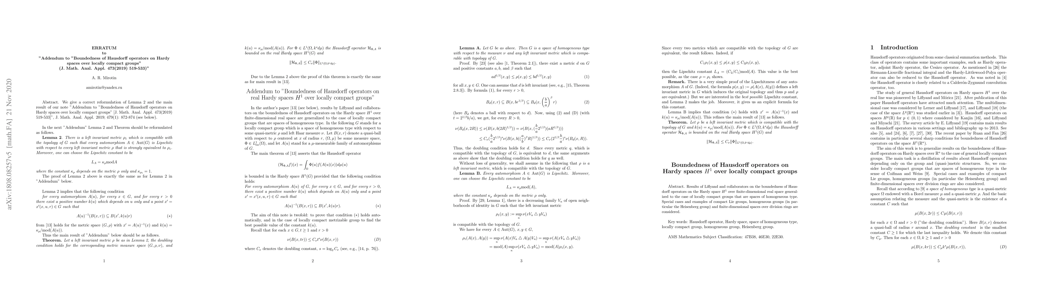 Results of Liflyand and collaborators on the boundedness of Hausdorff operators on the Hardy space $H^1$ over finite-dimensional real space generalized to the case of locally compact groups that are spaces of homogeneous type. Special cases and examples of compact Lie groups, homogeneous groups (in particular the Heisenberg group) and finite-dimensional spaces over division rings are considered.