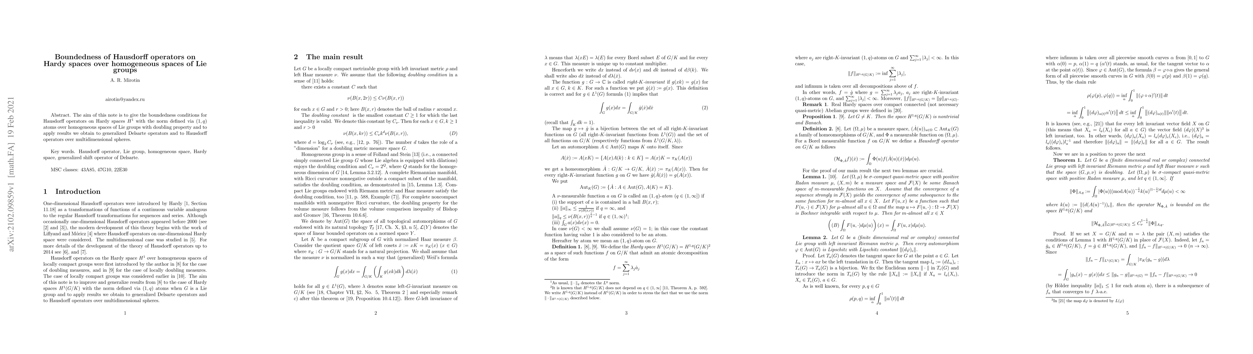 This paper establishes boundedness conditions for Hausdorff operators on Hardy spaces $H^{1}$ over homogeneous spaces of Lie groups with a doubling property, utilizing $(1,q)$ atoms, and applies these results to generalized Delsarte operators and Hausdorff operators over multidimensional spheres.