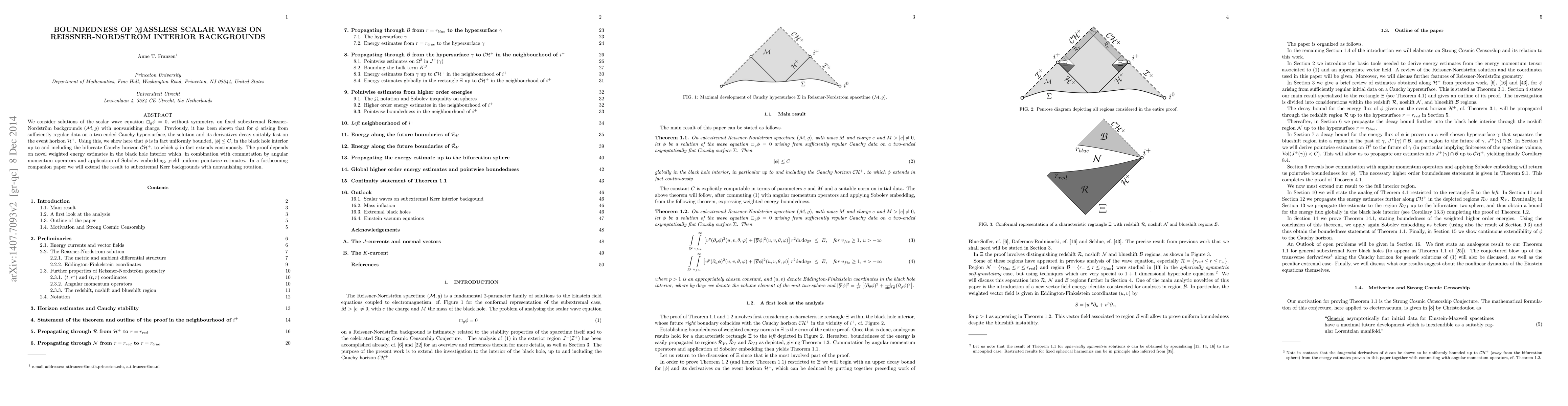 We consider solutions of the scalar wave equation $\Box_g\phi=0$, without symmetry, on fixed subextremal Reissner-Nordstr\"om backgrounds $({\mathcal M}, g)$ with nonvanishing charge. Previously, it has been shown that for $\phi$ arising from sufficiently regular data on a two ended Cauchy hypersurface, the solution and its derivatives decay suitably fast on the event horizon ${\mathcal H}^+$. Using this, we show here that $\phi$ is in fact uniformly bounded, $|\phi| \leq C$, in the black hole interior up to and including the bifurcate Cauchy horizon ${\mathcal C}{\mathcal H}^+$, to which $\phi$ in fact extends continuously. The proof depends on novel weighted energy estimates in the black hole interior which, in combination with commutation by angular momentum operators and application of Sobolev embedding, yield uniform pointwise estimates. In a forthcoming companion paper we will extend the result to subextremal Kerr backgrounds with nonvanishing rotation.