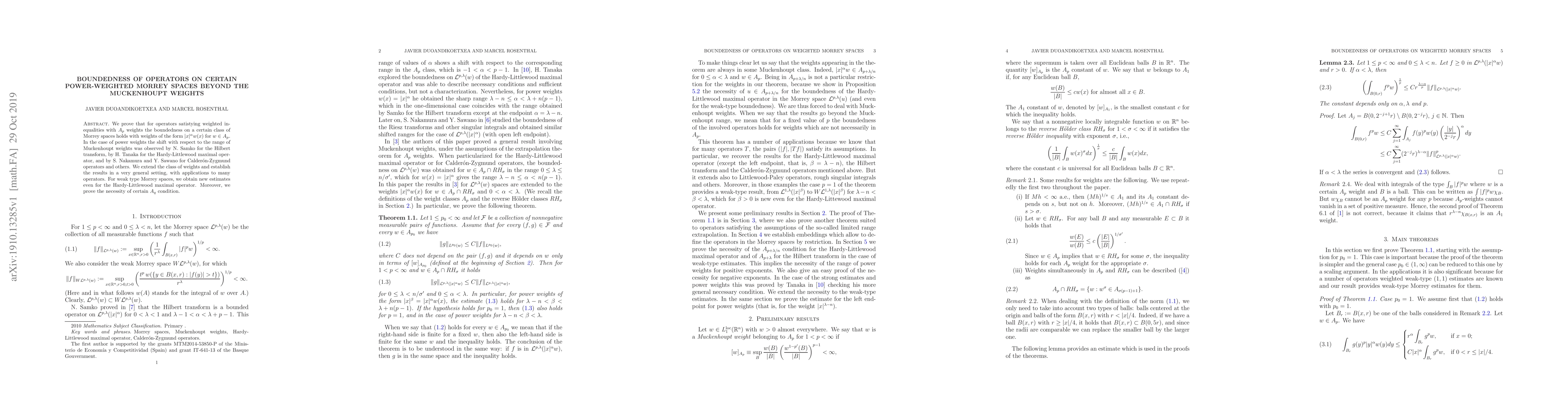 This paper proves the boundedness of operators on a class of Morrey spaces with weights of the form $|x|^\alpha w(x)$ for $w \in A_p$, extending beyond traditional Muckenhoupt weights. It also establishes new estimates for weak type Morrey spaces and proves the necessity of certain $A_q$ conditions.