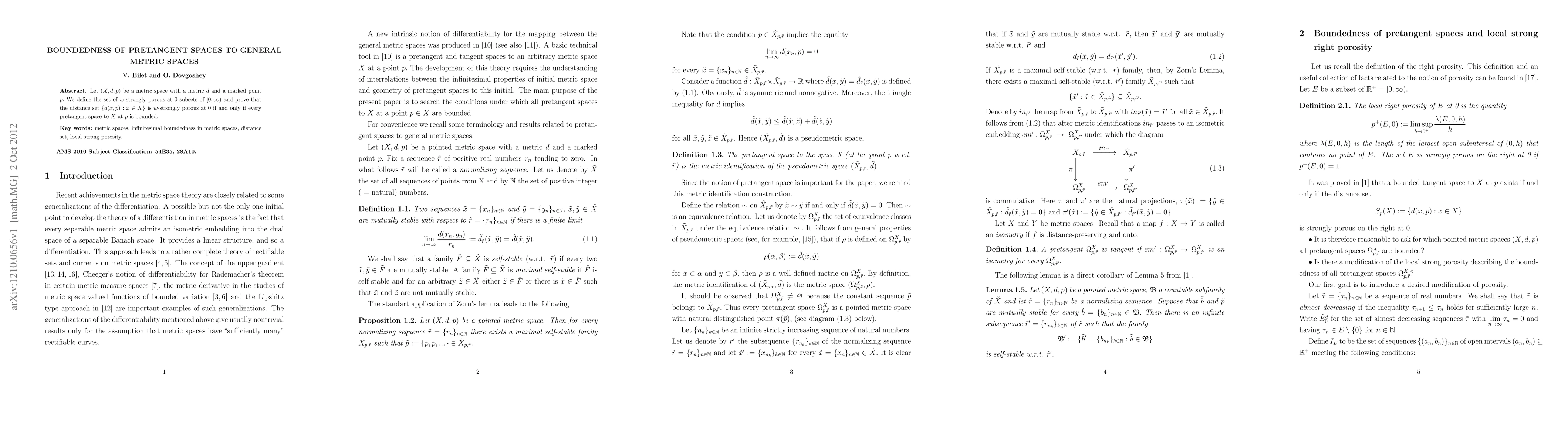 This paper investigates the boundedness of pretangent spaces in metric spaces, proving that the distance set from a marked point is w-strongly porous at 0 if and only if all pretangent spaces at that point are bounded.