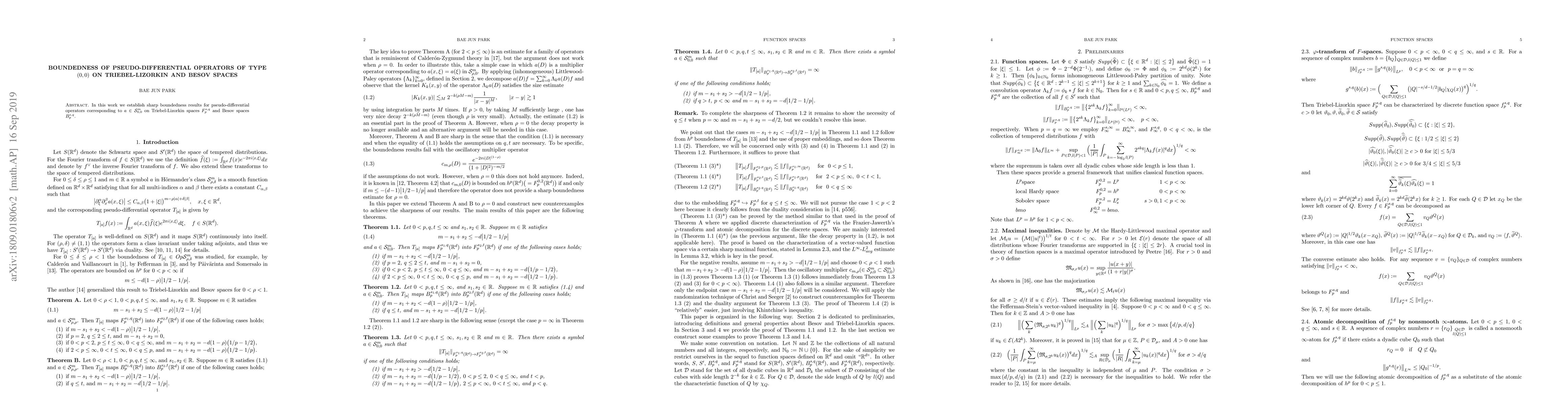 This paper establishes precise boundedness results for pseudo-differential operators of type (0,0) on Triebel-Lizorkin spaces $F_p^{s,q}$ and Besov spaces $B_p^{s,q}$. The findings provide sharp estimates for these operators.