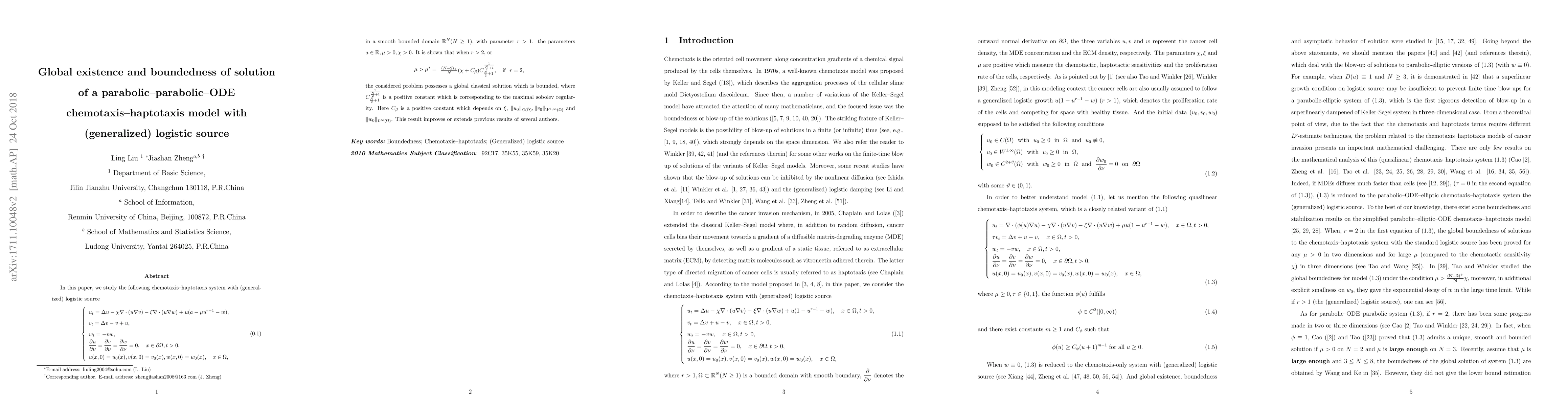 In this paper, we study the following chemotaxis--haptotaxis system with (generalized) logistic source $$ \left\{\begin{array}{ll} u_t=\Delta u-\chi\nabla\cdot(u\nabla v)- \xi\nabla\cdot(u\nabla w)+u(a-\mu u^{r-1}-w), \displaystyle{v_t=\Delta v- v +u},\quad \\ \displaystyle{w_t=- vw},\quad\\ \displaystyle{\frac{\partial u}{\partial \nu}=\frac{\partial v}{\partial \nu}=\frac{\partial w}{\partial \nu}=0},\quad x\in \partial\Omega, t>0,\\ \displaystyle{u(x,0)=u_0(x)},v(x,0)=v_0(x),w(x,0)=w_0(x),\quad x\in \Omega, \end{array}\right.\eqno(0.1) $$ %under homogeneous Neumann boundary conditions in a smooth bounded domain $\mathbb{R}^N(N\geq1)$, with parameter $r>1$. the parameters $a\in \mathbb{R}, \mu>0, \chi>0$. It is shown that when $r>2$, or \begin{equation*} \mu>\mu^{*}=\begin{array}{ll} \frac{(N-2)_{+}}{N}(\chi+C_{\beta}) C^{\frac{1}{\frac{N}{2}+1}}_{\frac{N}{2}+1},~~~\mbox{if}~~r=2, \end{array} \end{equation*} % $\mu>\frac{(N-2)_{+}}{N}\chi C^{\frac{1}{\frac{N}{2}+1}}_{\frac{N}{2}+1}$, the considered problem possesses a global classical solution which is bounded, where $C^{\frac{1}{\frac{N}{2}+1}}_{\frac{N}{2}+1}$ is a positive constant which is corresponding to the maximal sobolev regularity. Here $C_{\beta}$ is a positive constant which depends on $\xi$, $\|u_0\|_{C(\bar{\Omega})},\|v_0\|_{W^{1,\infty}(\Omega)}$ and $\|w_0\|_{L^\infty(\Omega)}$. This result improves or extends previous results of several authors.