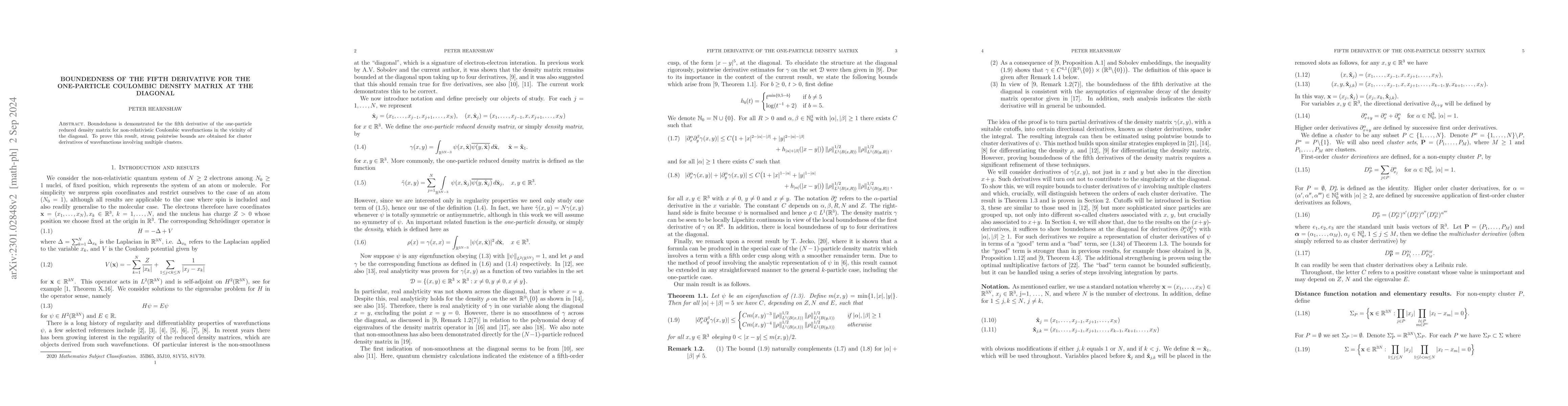 Summary: The research establishes that the fifth off-diagonal derivative of the one-particle reduced density matrix for non-relativistic Coulombic wavefunctions remains bounded near the diagonal. This finding provides insight into the behavior of electron density in Coulombic systems.
