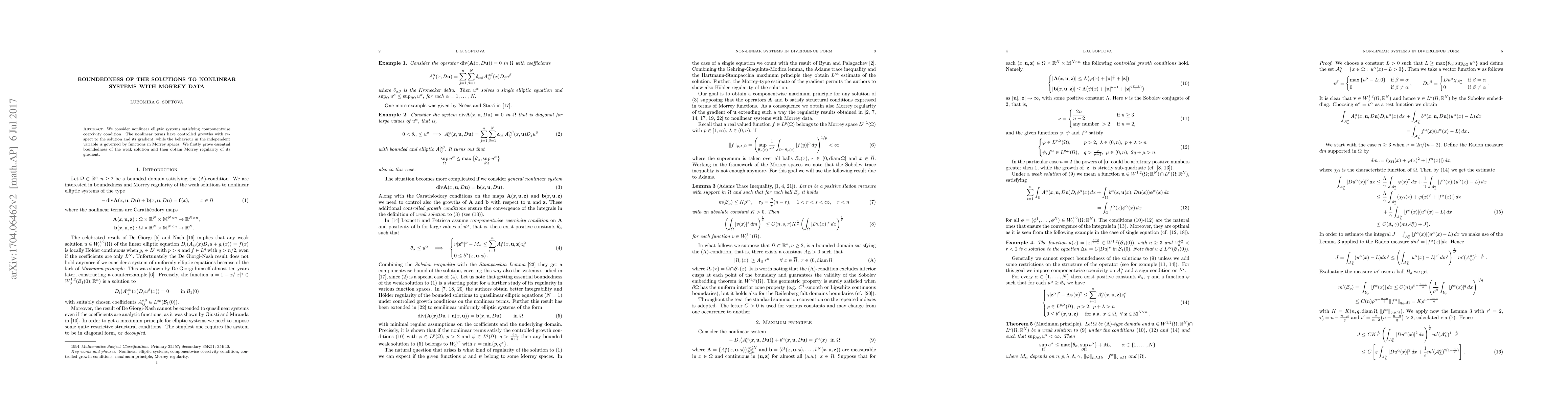 This paper investigates nonlinear elliptic systems with Morrey space data, proving essential boundedness of the weak solution and establishing Morrey regularity for the solution's gradient under componentwise coercivity and controlled growth conditions.