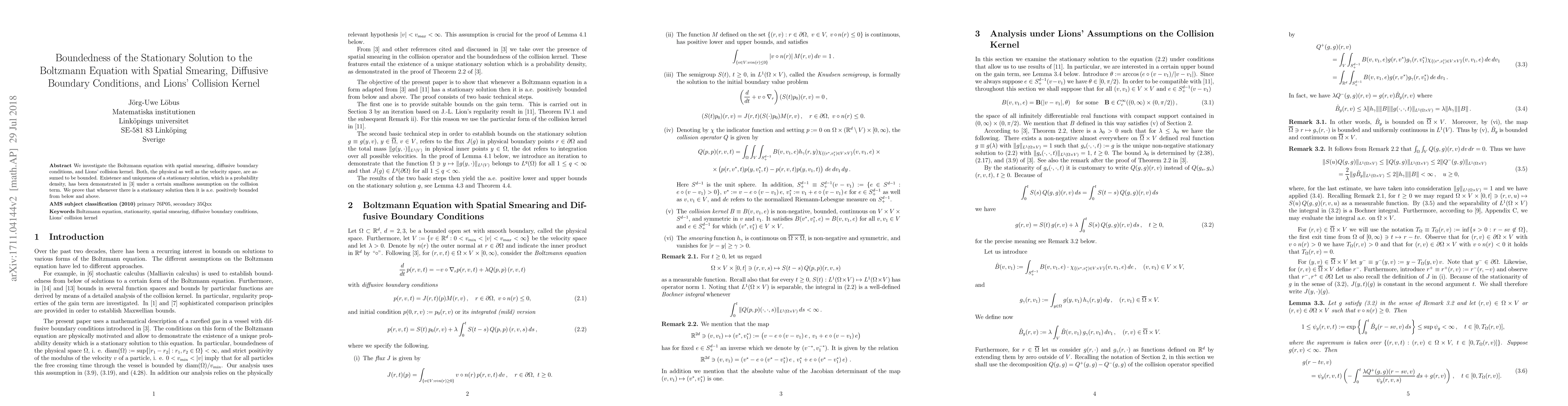 This paper proves the boundedness of the stationary solution to the Boltzmann equation under spatial smearing, diffusive boundary conditions, and Lions' collision kernel, showing that the solution is a probability density that is positively bounded from below and above. The result extends previous findings on existence and uniqueness under a smallness assumption on the collision term.