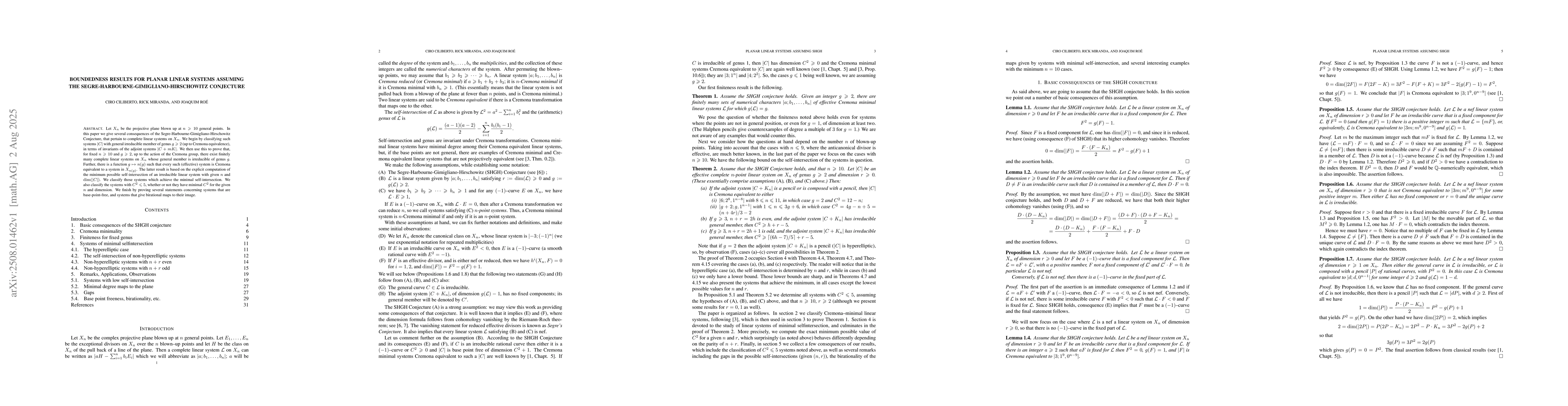 Let $X_n$ be the projective plane blown up at $n \geq 10$ general points. In this paper we give several consequences of the Segre-Harbourne-Gimigliano-Hirschowitz Conjecture, that pertain to complete linear systems on $X_n$. We begin by classifying such systems $|C|$ with general irreducible member of genus $g \geq 2$ (up to Cremona equivalence), in terms of invariants of the adjoint systems $|C+mK|$. We then use this to prove that, for fixed $n \geq 10$ and $g\geq 2$, up to the action of the Cremona group, there exist finitely many complete linear systems on $X_n$ whose general member is irreducible of genus $g$. Further, there is a function $g\mapsto n(g)$ such that every such (effective) system is Cremona equivalent to a system in $X_{n(g)}$. The latter result is based on the explicit computation of the minimum possible self-intersection of an irreducible linear system with given $n$ and $\dim(|C|)$. We classify those systems which achieve the minimal self-intersection. We also classify the systems with $C^2 \leq 5$, whether or not they have minimal $C^2$ for the given $n$ and dimension. We finish by proving several statements concerning systems that are base-point-free, and systems that give birational maps to their image.