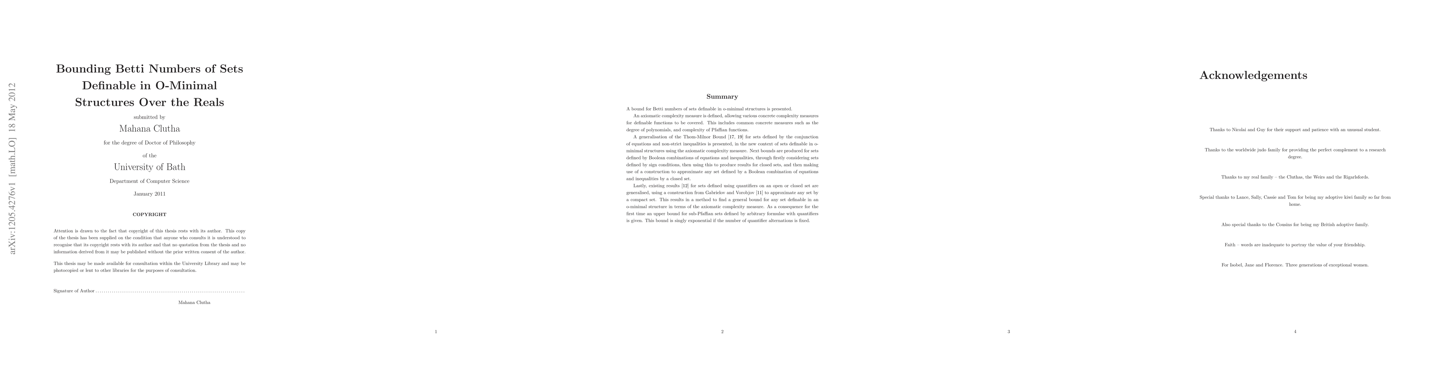 This paper presents a bound for Betti numbers of sets definable in o-minimal structures, introducing an axiomatic complexity measure that encompasses various complexity measures for definable functions. It generalizes the Thom-Milnor Bound and provides bounds for sets defined by Boolean combinations of equations and inequalities, ultimately yielding a general upper bound for sub-Pfaffian sets.