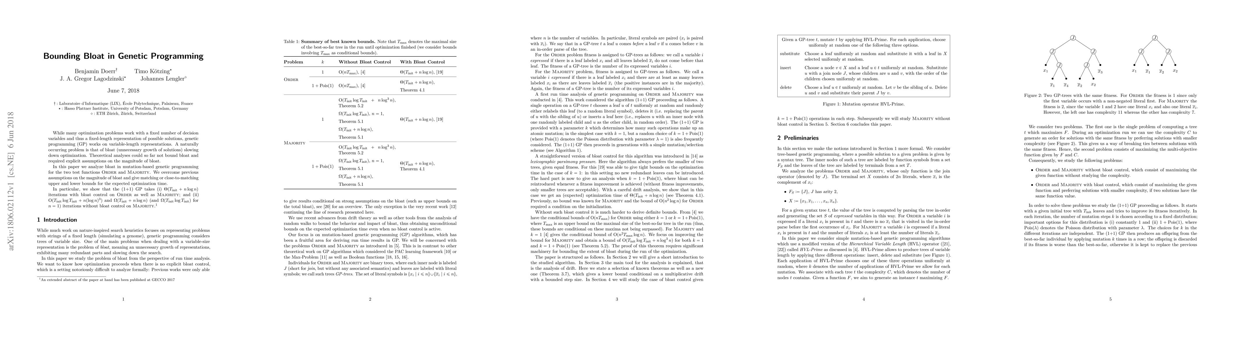 This paper analyzes bloat in mutation-based genetic programming for ORDER and MAJORITY test functions, providing tight upper and lower bounds for expected optimization time. It demonstrates that (1+1) GP requires $\Theta(T_{init} + n \log n)$ iterations with bloat control and $O(T_{init} \log T_{init} + n (\log n)^3)$ iterations without, overcoming previous assumptions on bloat magnitude.