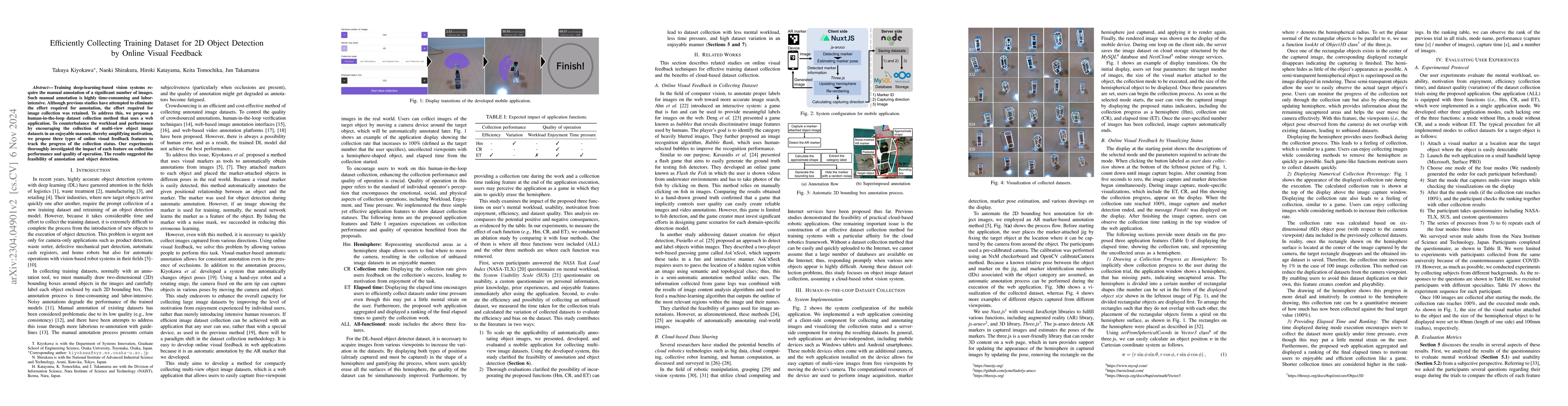This study proposes a mobile application to automate the collection of multi-view object image datasets with bounding box annotations, overcoming limitations of previous fixed-point camera methods. The gamified features in the app enhance user engagement and motivation, reducing mental workload and time pressure while collecting data.