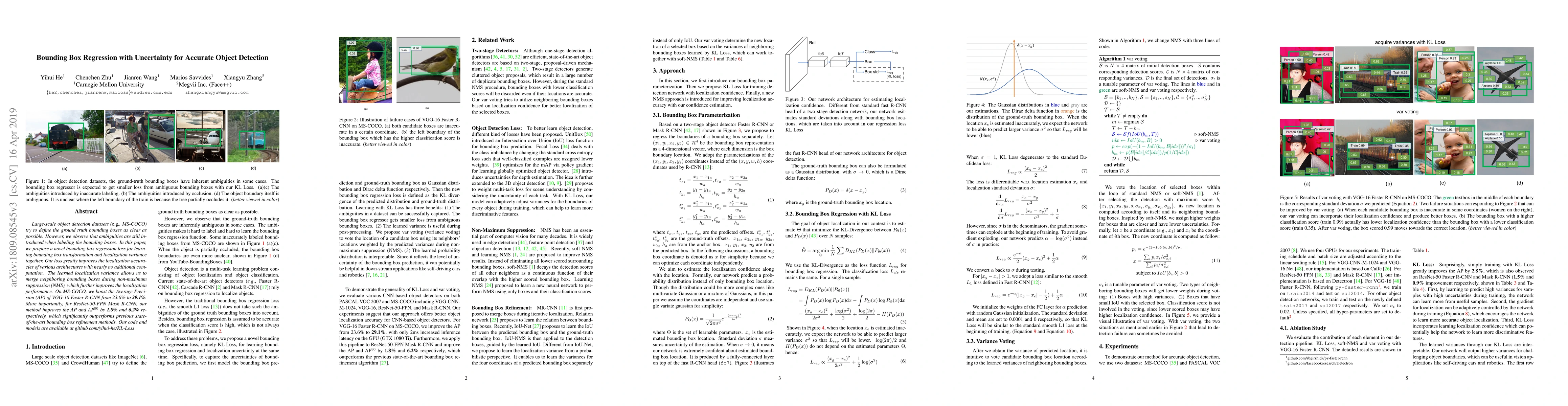 This paper introduces a novel bounding box regression loss that incorporates uncertainty to enhance object detection accuracy, significantly improving localization performance across various architectures with minimal computational overhead. The method also merges neighboring boxes during non-maximum suppression, further boosting detection precision.