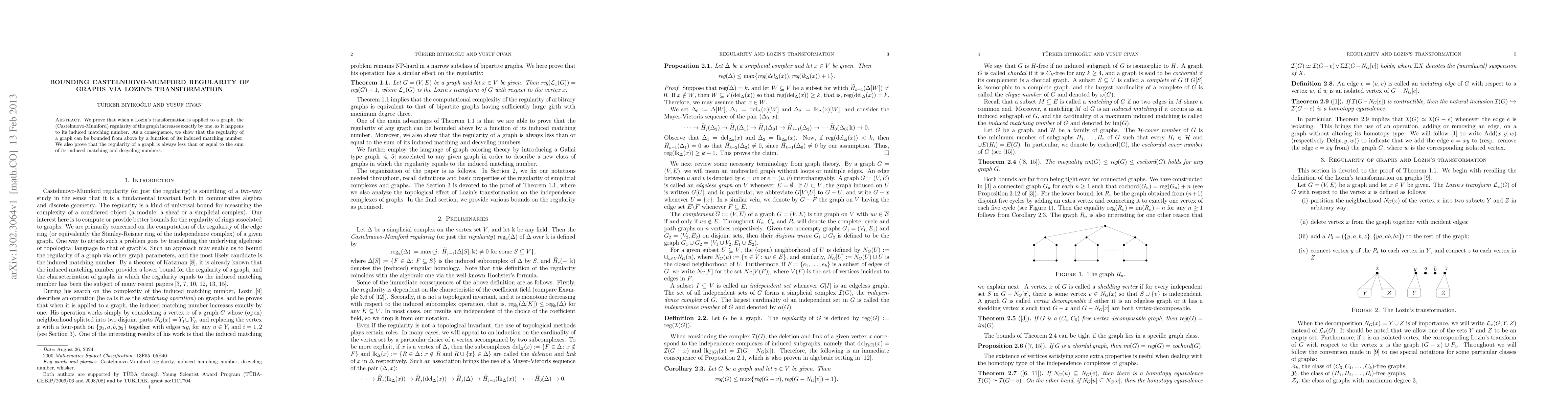 Summary: This paper demonstrates that applying Lozin's transformation to a graph increases its Castelnuovo-Mumford regularity by exactly one, mirroring the rise in its induced matching number. It concludes by showing that a graph's regularity is bounded above by a function of its induced matching number and is always less than or equal to the sum of its induced matching and decycling numbers.