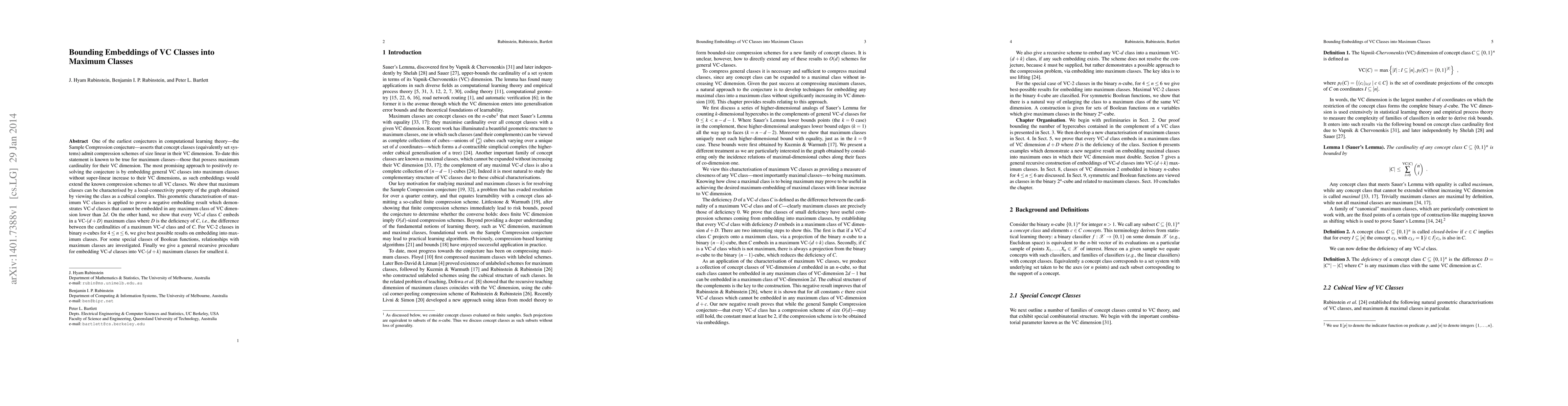 This paper explores embedding general VC classes into maximum classes to resolve the Sample Compression conjecture. It demonstrates that maximum classes exhibit a local-connectivity property in their cubical complex representation, and uses this to prove that certain VC-d classes cannot be embedded in lower-dimensional maximum classes. It also presents a method for embedding any VC-d class into a VC-(d+D) maximum class, where D is the deficiency of the class, and provides specific results for VC-2 classes in binary n-cubes for 4 ≤ n ≤ 6.