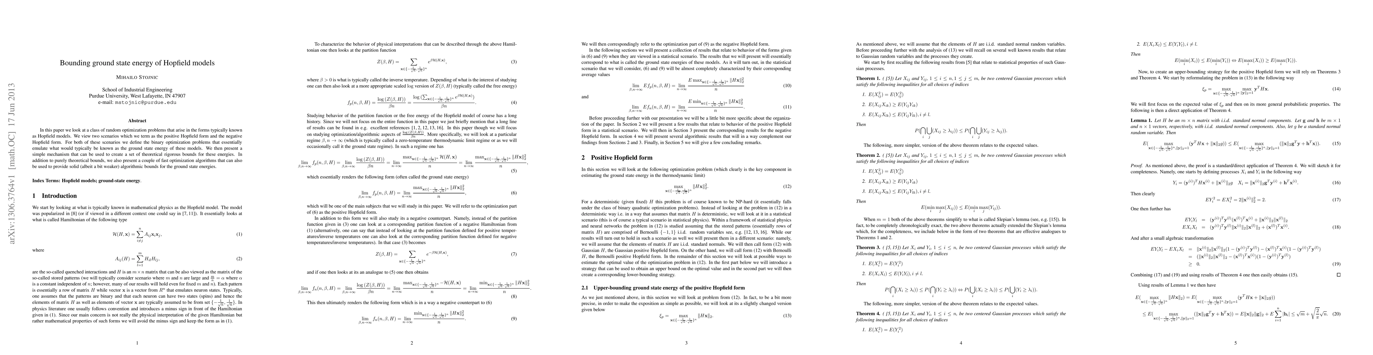 In this paper we look at a class of random optimization problems that arise in the forms typically known as Hopfield models. We view two scenarios which we term as the positive Hopfield form and the negative Hopfield form. For both of these scenarios we define the binary optimization problems that essentially emulate what would typically be known as the ground state energy of these models. We then present a simple mechanism that can be used to create a set of theoretical rigorous bounds for these energies. In addition to purely theoretical bounds, we also present a couple of fast optimization algorithms that can also be used to provide solid (albeit a bit weaker) algorithmic bounds for the ground state energies.