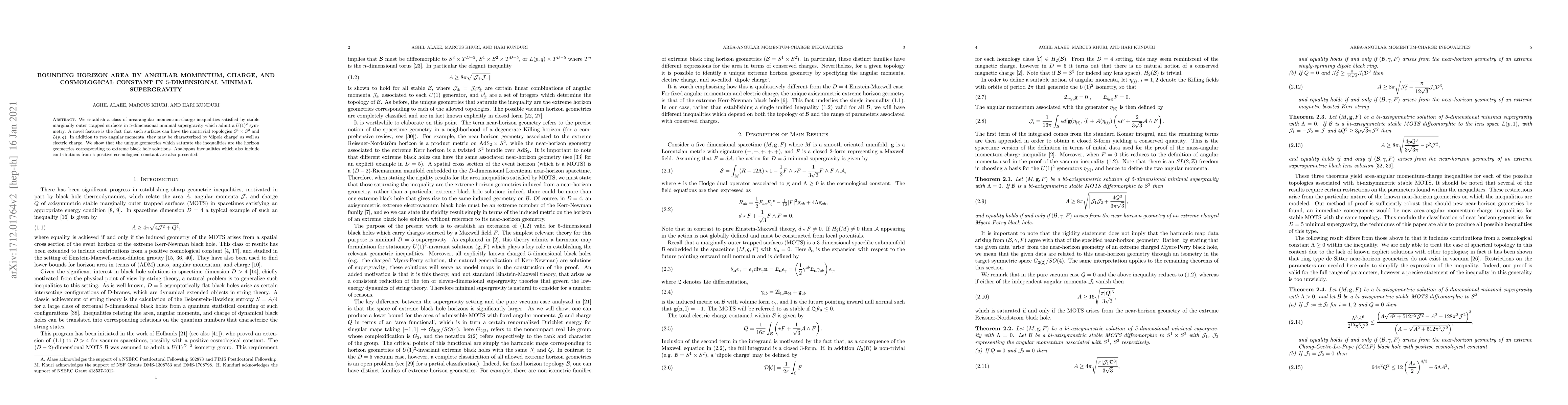 We establish a class of area-angular momentum-charge inequalities satisfied by stable marginally outer trapped surfaces in 5-dimensional minimal supergravity which admit a $U(1)^2$ symmetry. A novel feature is the fact that such surfaces can have the nontrivial topologies $S^1 \times S^2$ and $L(p,q)$. In addition to two angular momenta, they may be characterized by `dipole charge' as well as electric charge. We show that the unique geometries which saturate the inequalities are the horizon geometries corresponding to extreme black hole solutions. Analogous inequalities which also include contributions from a positive cosmological constant are also presented.