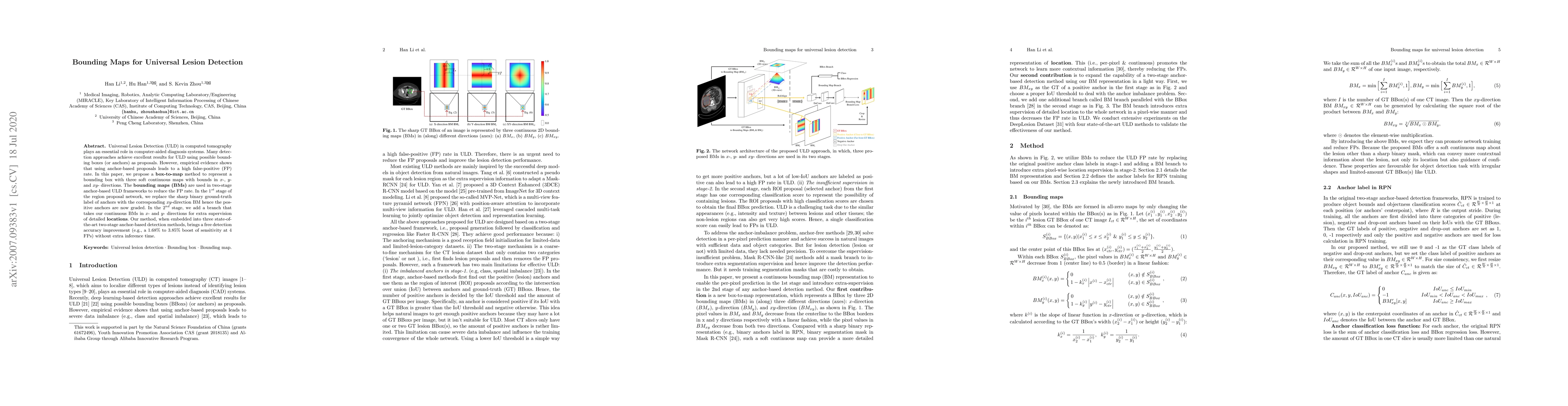 Universal Lesion Detection (ULD) in computed tomography plays an essential role in computer-aided diagnosis systems. Many detection approaches achieve excellent results for ULD using possible bounding boxes (or anchors) as proposals. However, empirical evidence shows that using anchor-based proposals leads to a high false-positive (FP) rate. In this paper, we propose a box-to-map method to represent a bounding box with three soft continuous maps with bounds in x-, y- and xy- directions. The bounding maps (BMs) are used in two-stage anchor-based ULD frameworks to reduce the FP rate. In the 1 st stage of the region proposal network, we replace the sharp binary ground-truth label of anchors with the corresponding xy-direction BM hence the positive anchors are now graded. In the 2 nd stage, we add a branch that takes our continuous BMs in x- and y- directions for extra supervision of detailed locations. Our method, when embedded into three state-of-the-art two-stage anchor-based detection methods, brings a free detection accuracy improvement (e.g., a 1.68% to 3.85% boost of sensitivity at 4 FPs) without extra inference time.