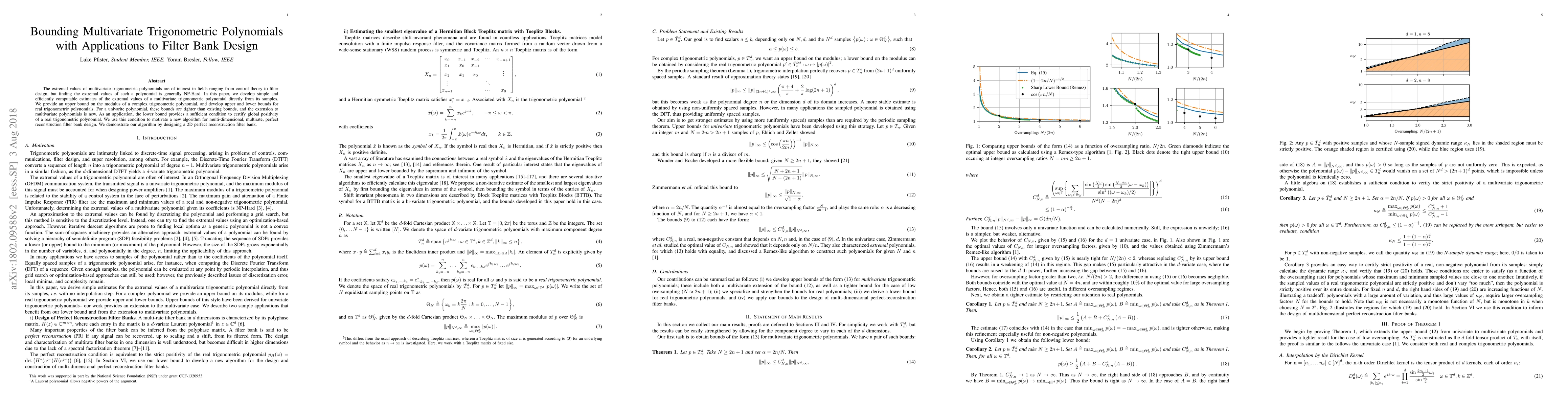 This paper develops computable estimates for extremal values of multivariate trigonometric polynomials, offering tighter bounds than existing methods for univariate cases and introducing new bounds for multivariate cases. The findings support a new algorithm for designing multi-dimensional, multirate, perfect reconstruction filter banks, demonstrated through a 2D filter bank example.