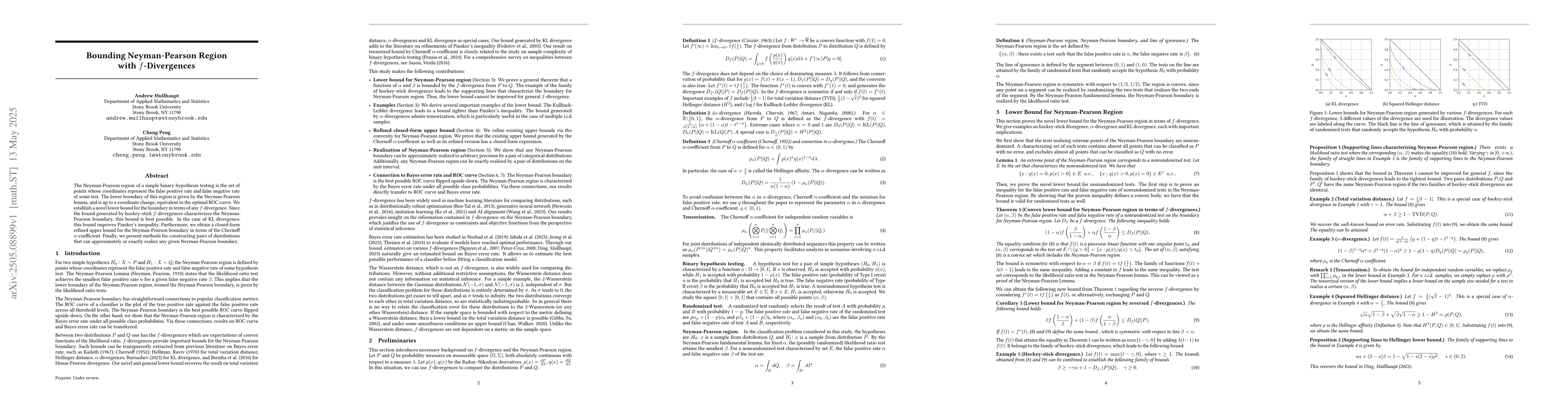 This work is novel due to its focus on $f$-divergences for bounding the Neyman-Pearson region, providing best-possible characterization with hockey-stick divergences, improving Pinsker's inequality, and presenting distribution construction methods for realizing given Neyman-Pearson boundaries.