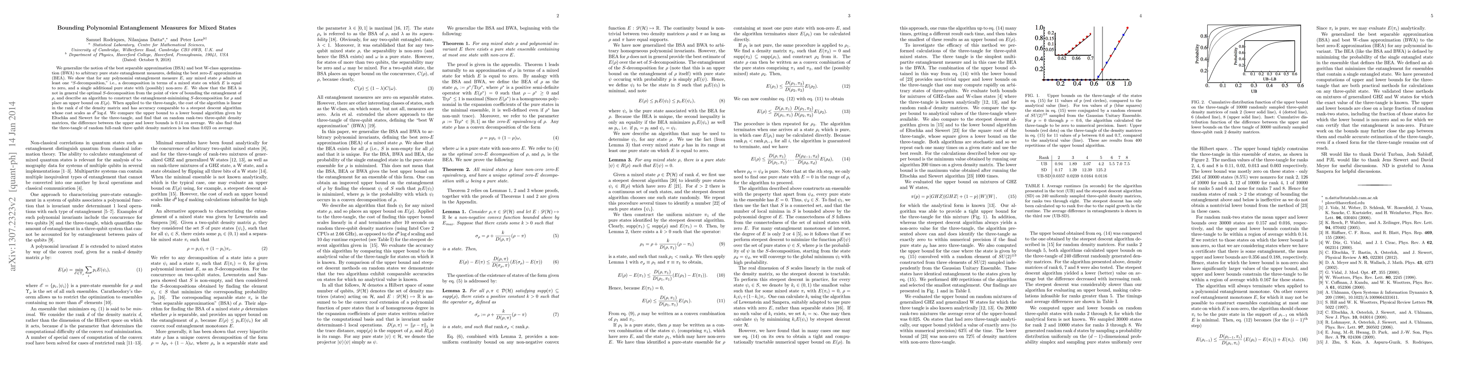 We generalize the notion of the best separable approximation (BSA) and best W-class approximation (BWA) to arbitrary pure state entanglement measures, defining the best zero-$E$ approximation (BEA). We show that for any polynomial entanglement measure $E$, any mixed state $\rho$ admits at least one "$S$-decomposition," i.e., a decomposition in terms of a mixed state on which $E$ is equal to zero, and a single additional pure state with (possibly) non-zero $E$. We show that the BEA is not in general the optimal $S$-decomposition from the point of view of bounding the entanglement of $\rho$, and describe an algorithm to construct the entanglement-minimizing $S$-decomposition for $\rho$ and place an upper bound on $E(\rho)$. When applied to the three-tangle, the cost of the algorithm is linear in the rank $d$ of the density matrix and has accuracy comparable to a steepest descent algorithm whose cost scales as $d^8 \log d$. We compare the upper bound to a lower bound algorithm given by Eltschka and Siewert for the three-tangle, and find that on random rank-two three-qubit density matrices, the difference between the upper and lower bounds is $0.14$ on average. We also find that the three-tangle of random full-rank three qubit density matrices is less than $0.023$ on average.