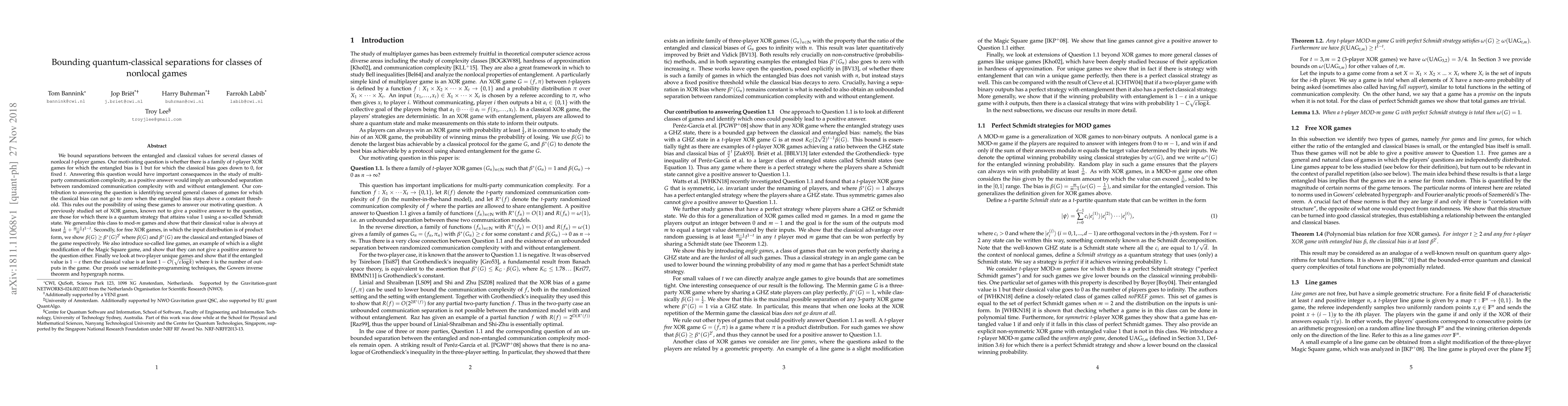 We bound separations between the entangled and classical values for several classes of nonlocal $t$-player games. Our motivating question is whether there is a family of $t$-player XOR games for which the entangled bias is $1$ but for which the classical bias goes down to $0$, for fixed $t$. Answering this question would have important consequences in the study of multi-party communication complexity, as a positive answer would imply an unbounded separation between randomized communication complexity with and without entanglement. Our contribution to answering the question is identifying several general classes of games for which the classical bias can not go to zero when the entangled bias stays above a constant threshold. This rules out the possibility of using these games to answer our motivating question. A previously studied set of XOR games, known not to give a positive answer to the question, are those for which there is a quantum strategy that attains value 1 using a so-called Schmidt state. We generalize this class to mod-$m$ games and show that their classical value is always at least $\frac{1}{m} + \frac{m-1}{m} t^{1-t}$. Secondly, for free XOR games, in which the input distribution is of product form, we show $\beta(G) \geq \beta^*(G)^{2^t}$ where $\beta(G)$ and $\beta^*(G)$ are the classical and entangled biases of the game respectively. We also introduce so-called line games, an example of which is a slight modification of the Magic Square game, and show that they can not give a positive answer to the question either. Finally we look at two-player unique games and show that if the entangled value is $1-\epsilon$ then the classical value is at least $1-\mathcal{O}(\sqrt{\epsilon \log k})$ where $k$ is the number of outputs in the game. Our proofs use semidefinite-programming techniques, the Gowers inverse theorem and hypergraph norms.