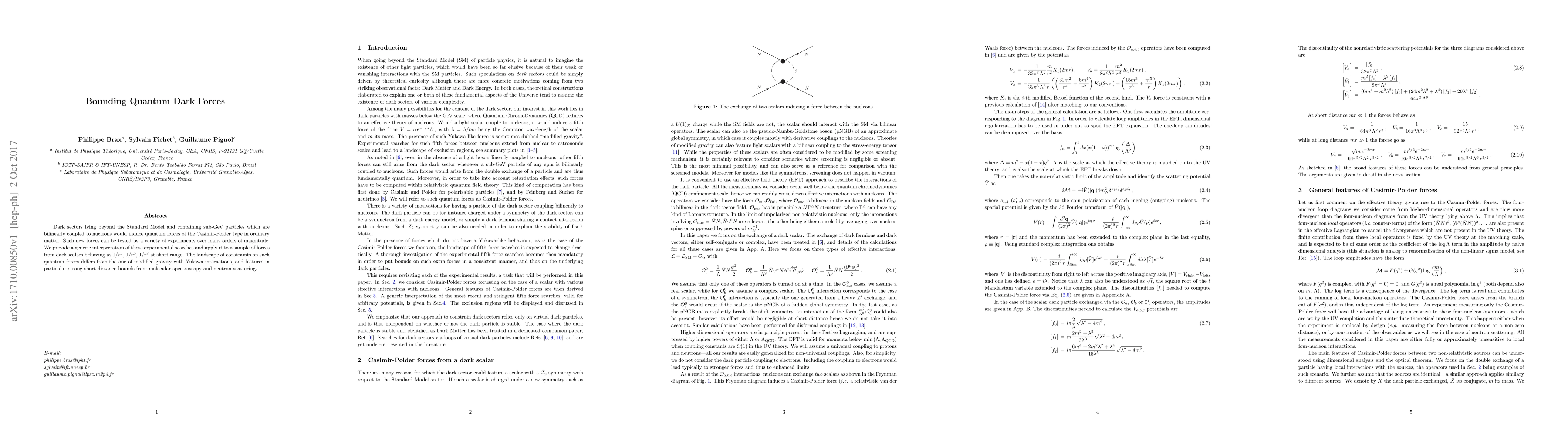 Dark sectors lying beyond the Standard Model and containing sub-GeV particles which are bilinearly coupled to nucleons would induce quantum forces of the Casimir-Polder type in ordinary matter. Such new forces can be tested by a variety of experiments over many orders of magnitude. We provide a generic interpretation of these experimental searches and apply it to a sample of forces from dark scalars behaving as $1/r^3$, $1/r^5$, $1/r^7$ at short range. The landscape of constraints on such quantum forces differs from the one of modified gravity with Yukawa interactions, and features in particular strong short-distance bounds from molecular spectroscopy and neutron scattering.
