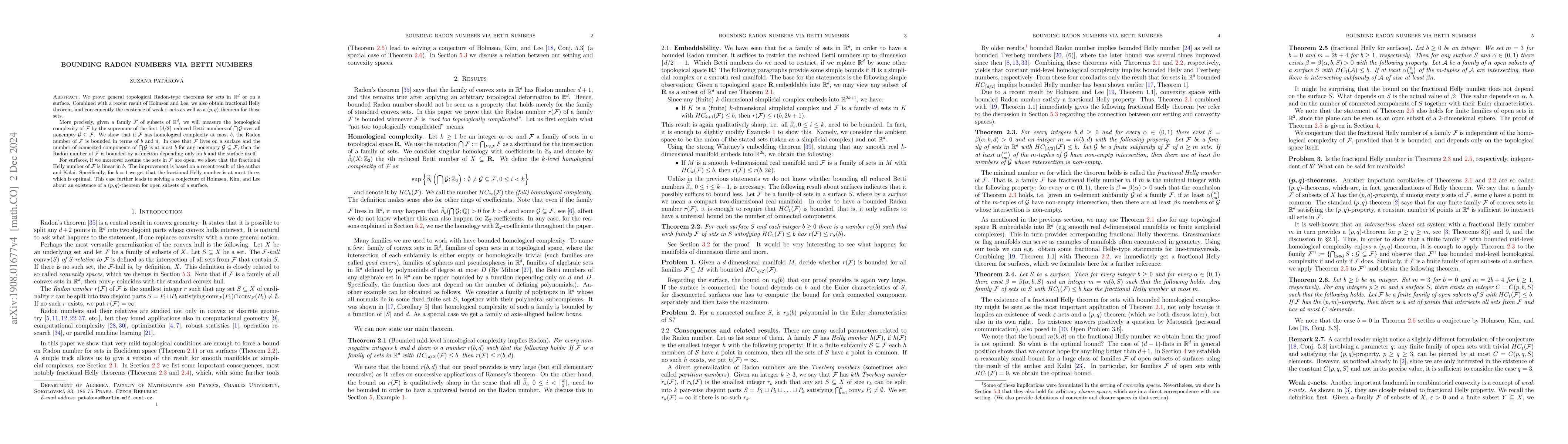 This paper establishes topological Radon-type theorems for sets in $\mathbb R^d$ and on surfaces, showing that the Radon number of a family of subsets is bounded by the homological complexity measured by Betti numbers. It also proves a fractional Helly theorem and the existence of weak $\varepsilon$-nets for these sets.